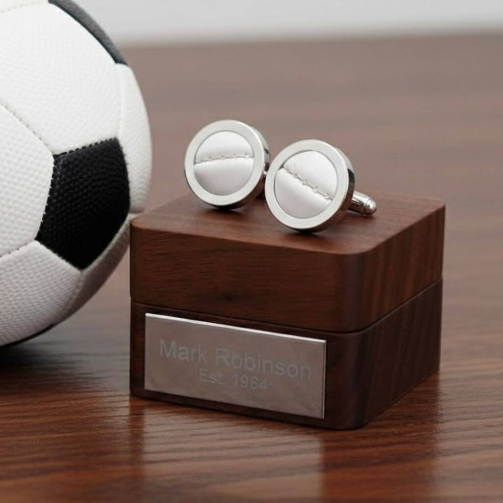Sleek and stylish cufflinks for football fans or players in a personalised walnut box.