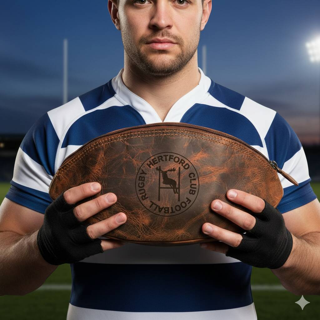 Striking handmade buffalo leather rugby ball washbag with watrproof lining, ideal for rugby players and fans. Personalised with any message.