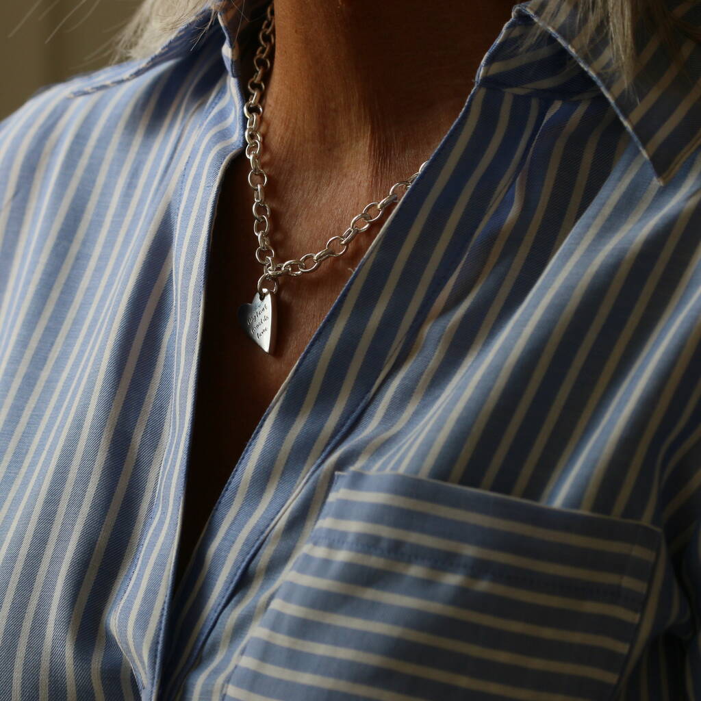 A sterling silver belcher chain necklace with handcrafted heart pendant that effortlessly blends classic style and contemporary charm.Each heart pendant is individually handcrafted in Britain, ensuring every piece is beautifully unique. The iconic belcher chain, with its distinctive oval links, provides the perfect backdrop for the complementary heart pendant, resulting in a cohesive design suited for any occasion. Whether dressed up for an evening out or styled casually during the day, this versatile necklace enhances your look effortlessly.