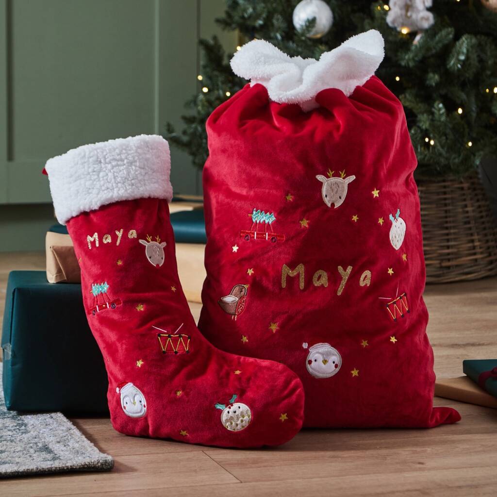 Our plush personalised Christmas sack with a matching embroidered stocking is just the thing to make this time unforgettable. The super-soft red sack, trimmed with fluffy white faux fur, is sprinkled with golden stars and adorned with festive favourites like a cheerful robin, reindeer, and a jolly Christmas pudding – ideal for holding Santa’s special deliveries. Complementing it, the matching red velvet stocking features the same magical snowy-white trim and detailed embroidered designs, from Rudolph to drum sets and smiling puddings, creating a delightfully traditional festive look. Personalise both with a little one’s name for a keepsake that will bring joy year after year.
