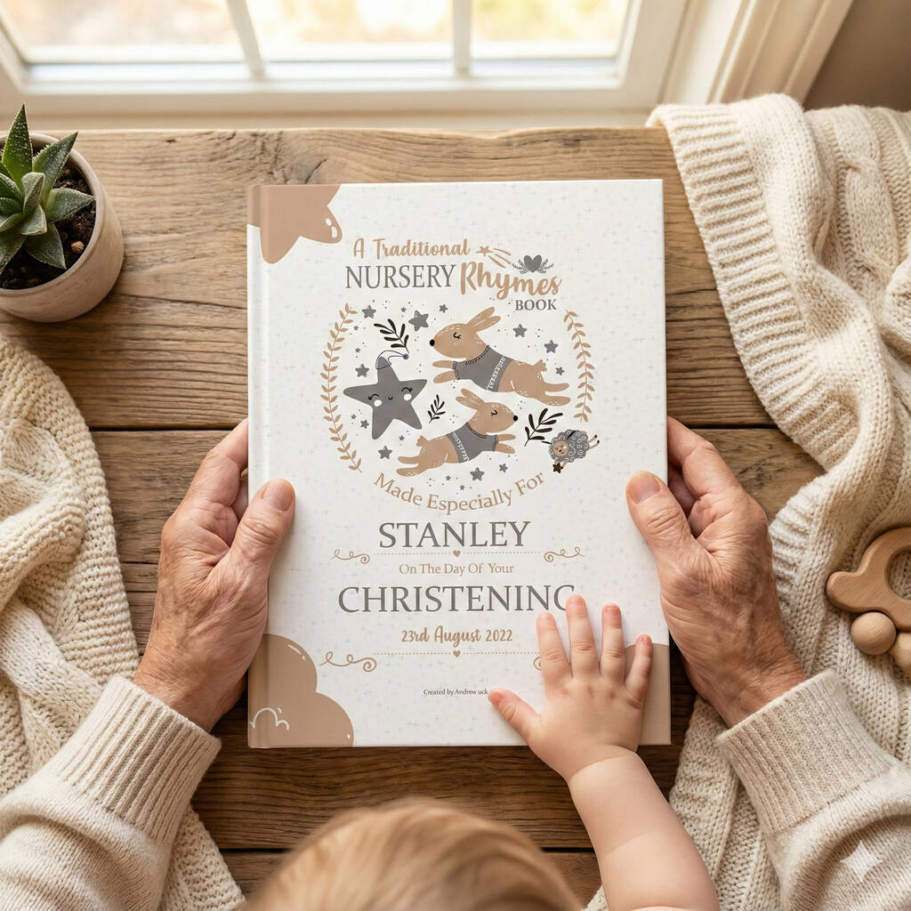 A Stunning Christening Keepsake Gift Book of Classic Nursery Rhymes Personalised for Baby. Customised with the Child's Name, Christening Date and Personal Message / Dedication