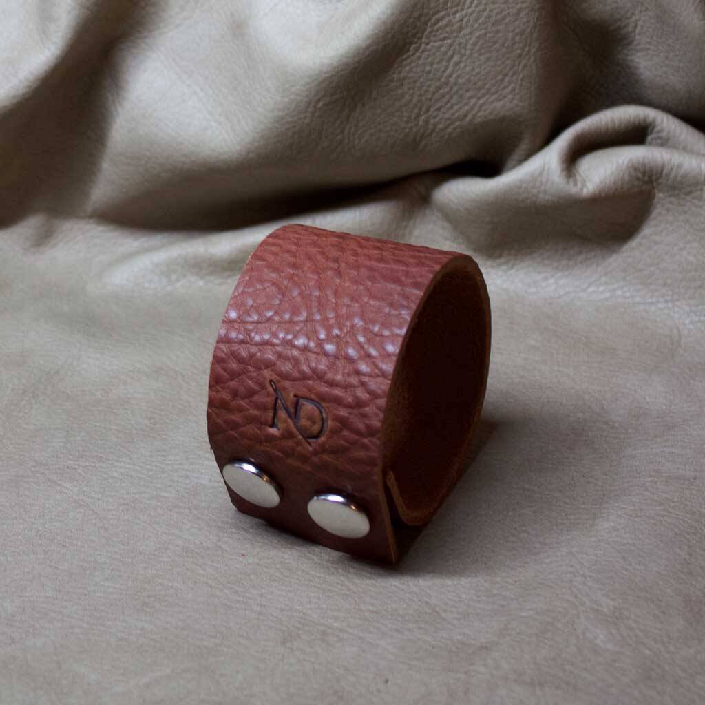 This handmade wide leather cuff bracelet is handmade from vegetable-tanned leather and finished with a refined silver button fastening, creating a confident piece. Its broader silhouette gives it a strong yet elegant presence, making it ideal for those who appreciate distinctive, timeless design.