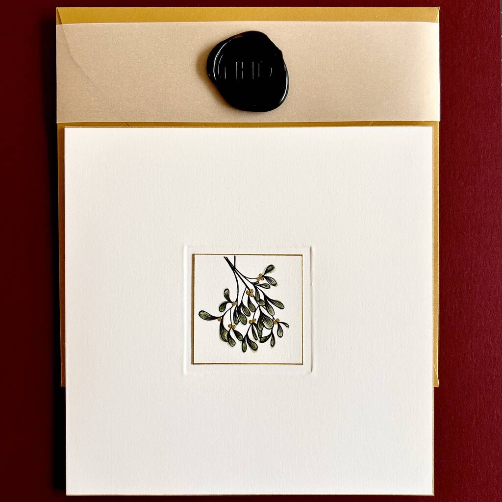 Handmade by Nicci from her studio in South West London, this set of luxury Christmas cards features a beautiful mistletoe original illustration set within a hand embossed border. The card is finished with a fine gold edge.