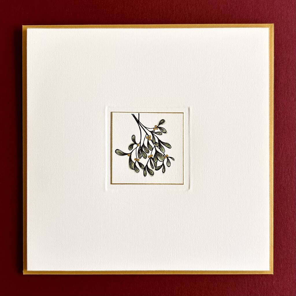 Completely hand crafted, the mistletoe is illustrated using pen and watercolours onto premium 300gsm watercolour paper (50% cotton), set within an embossed border and finished with a fine gold edge.