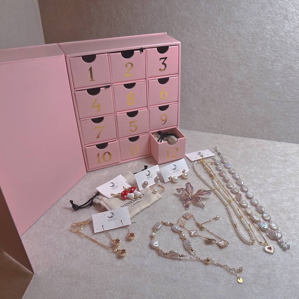 Unwrap the magic of Christmas with NINEMOO’s 12 Days Jewellery Advent Calendar.Each day reveals a carefully chosen jewellery piece – from timeless pearl studs to festive brooches – all packed in individual velvet pouches for gifting and safekeeping.
