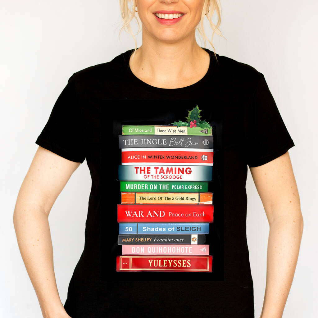 A funny Christmas T-shirt for book loving ladies, featuring playful literary puns like ‘50 Shades of Sleigh’ and ‘War and Peace on Earth’.