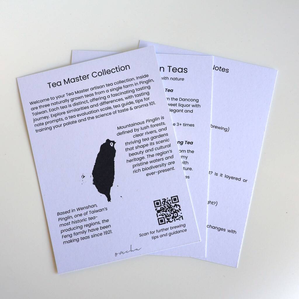 Welcome to your Tea Master artisan tea collection. Inside, you’ll discover three naturally grown teas from a single farm in Pinglin, Taiwan.