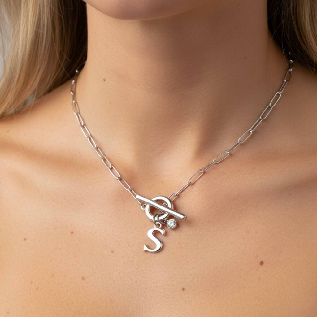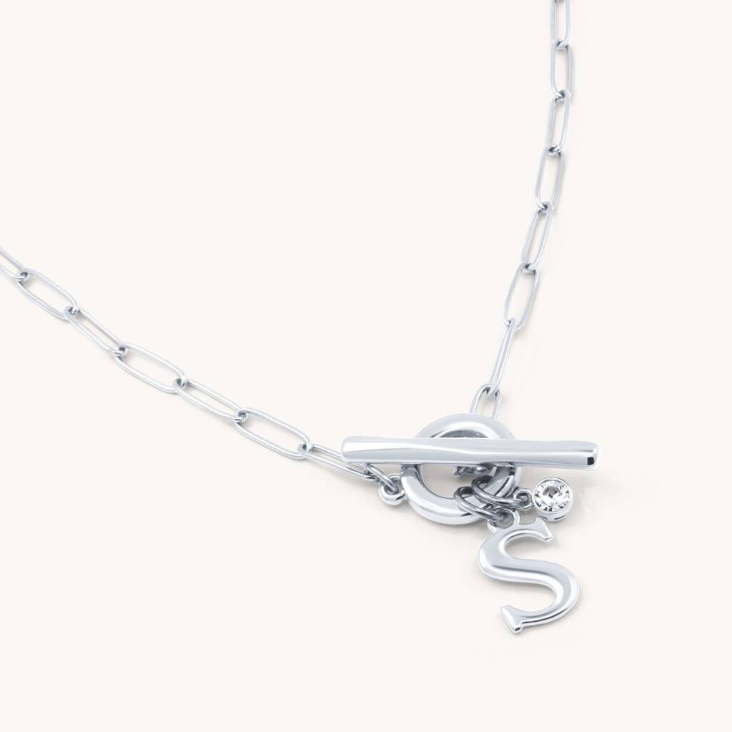 Silver Gracie Initial And Birthstone T Bar Necklace