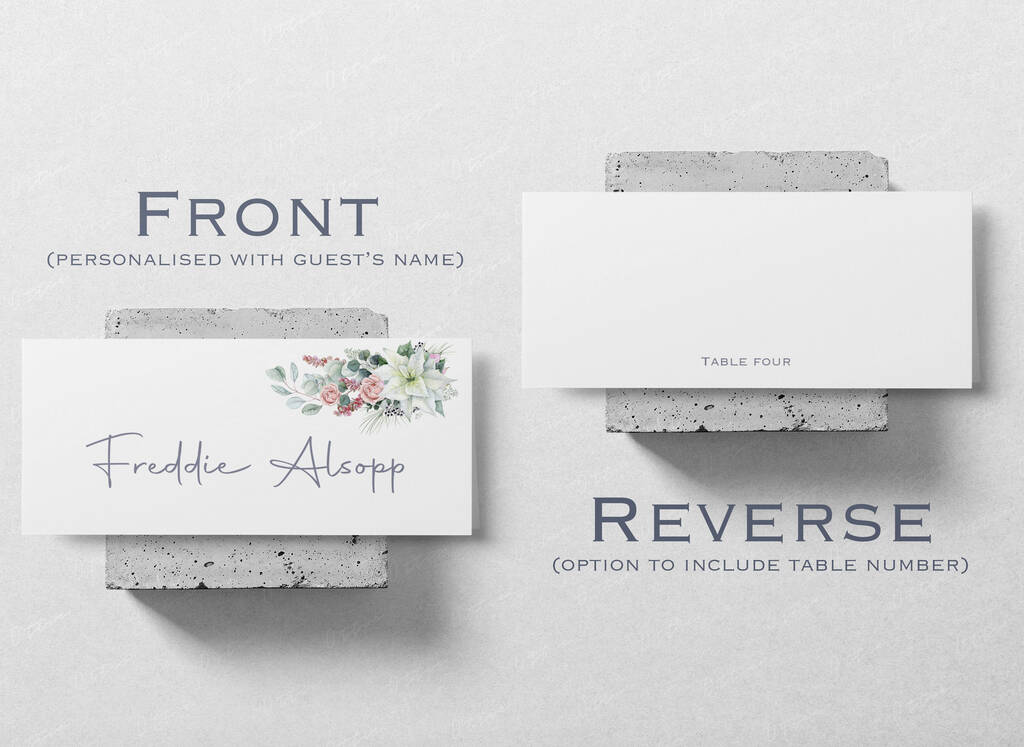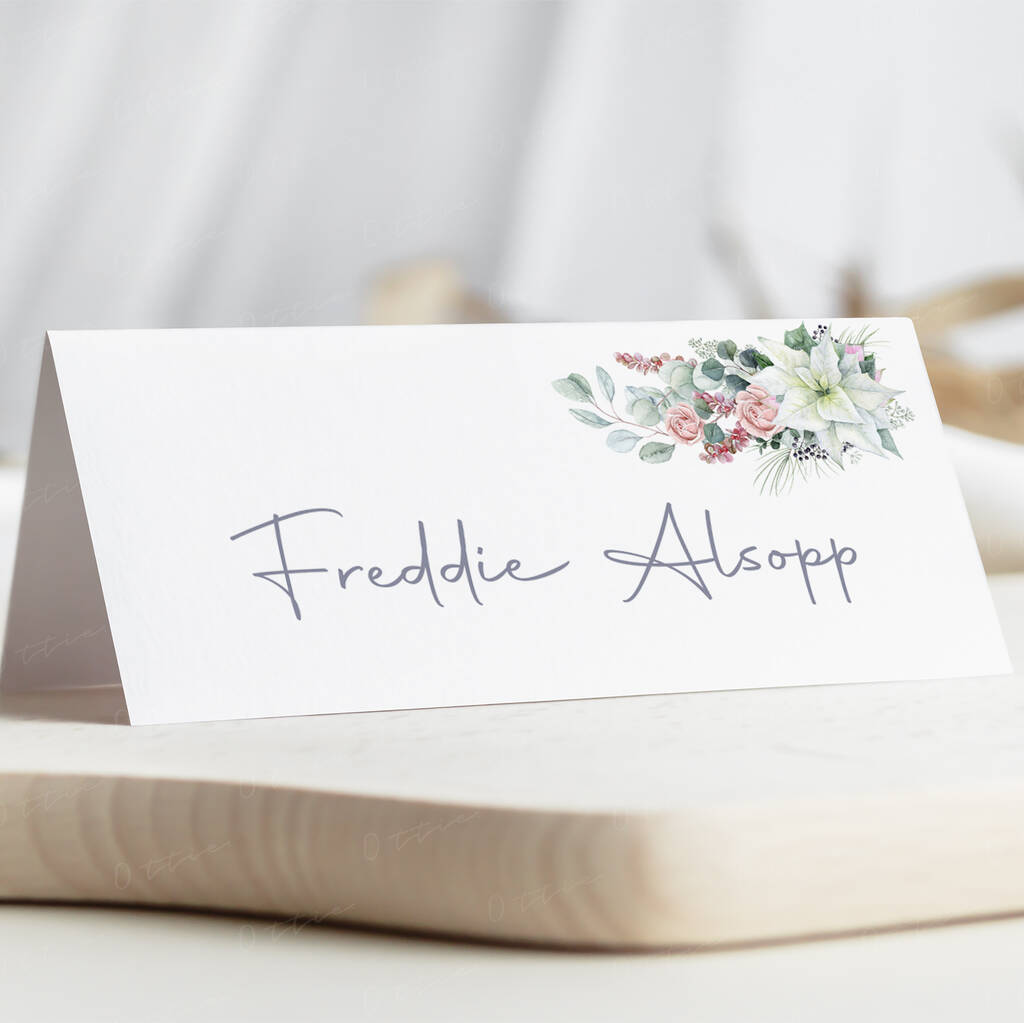 Personalised folded wedding place cards in a winter floral design, each card can be personalised with your guest name on.