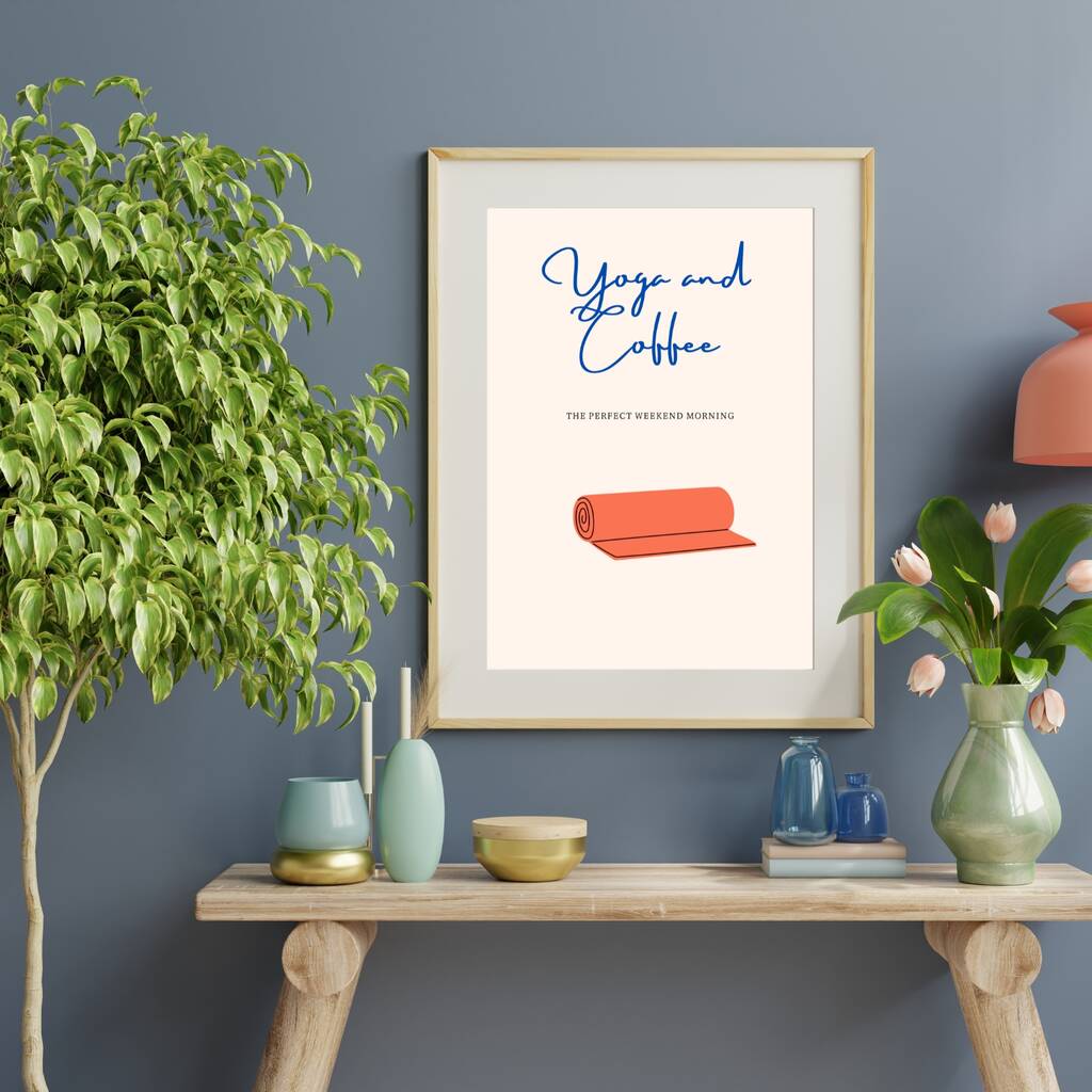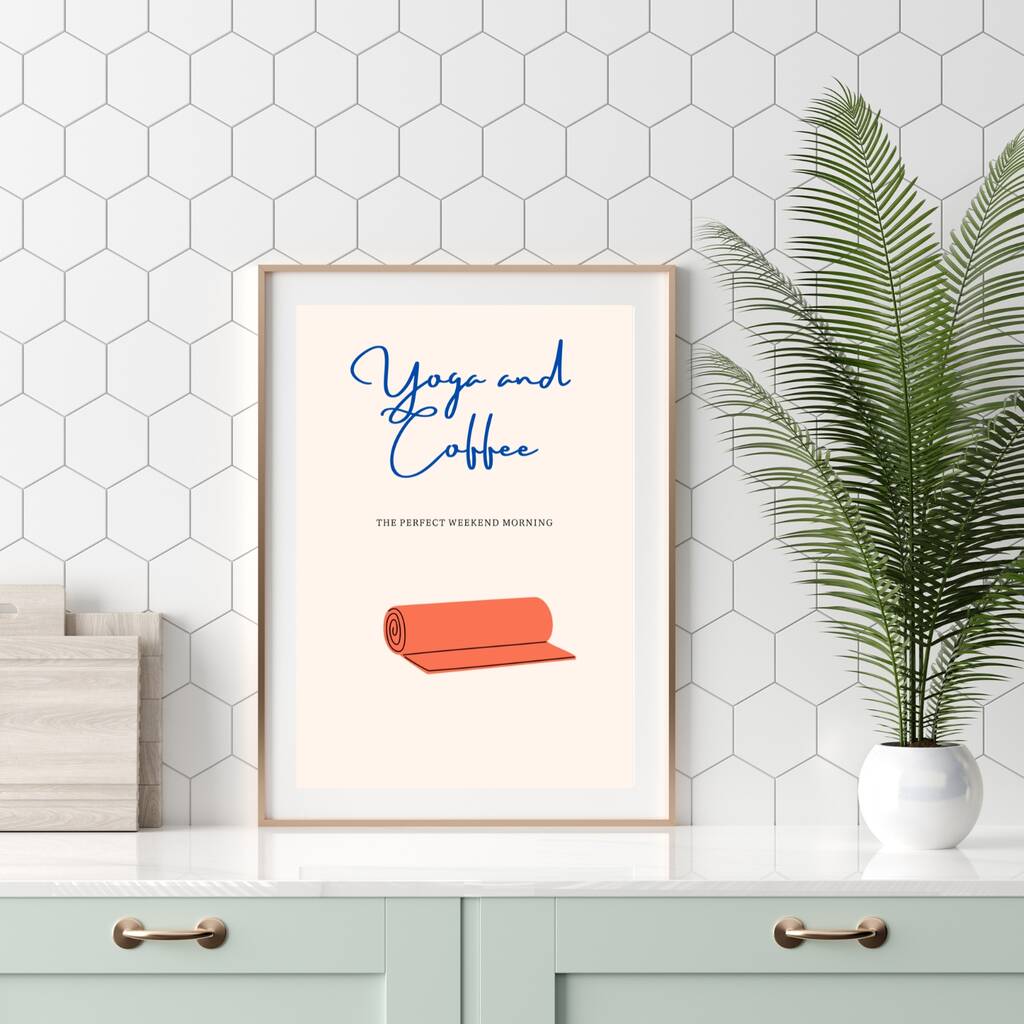 This contemporary design is part of our stylish, typography food and drink collection of art prints and reads "Yoga and coffee" and in smaller black text "the perfect weekend morning".