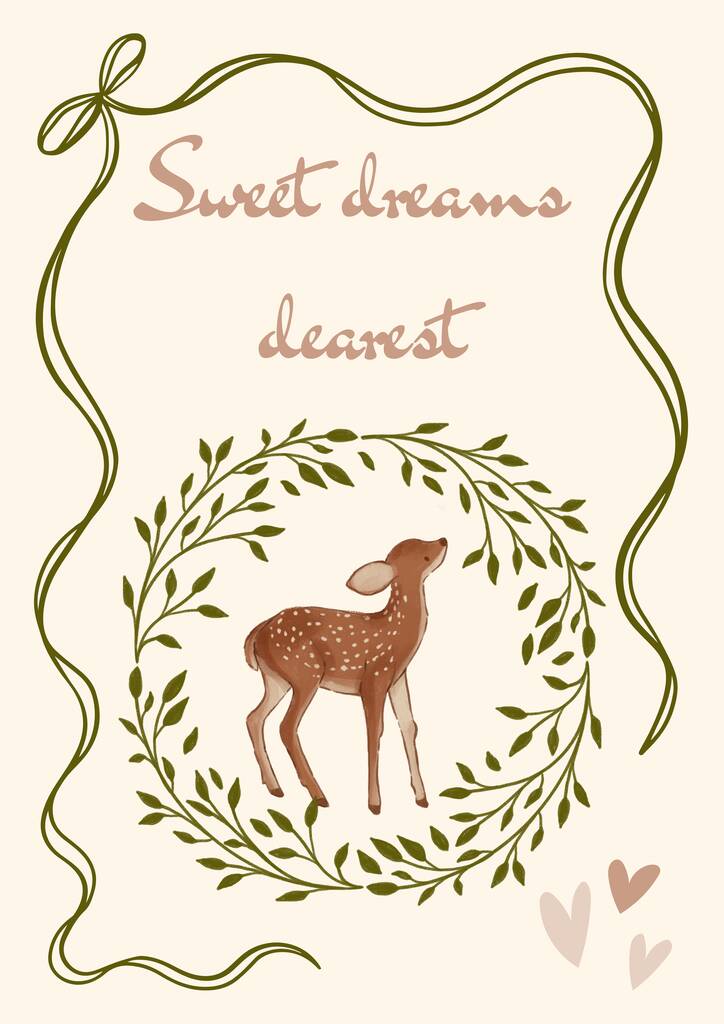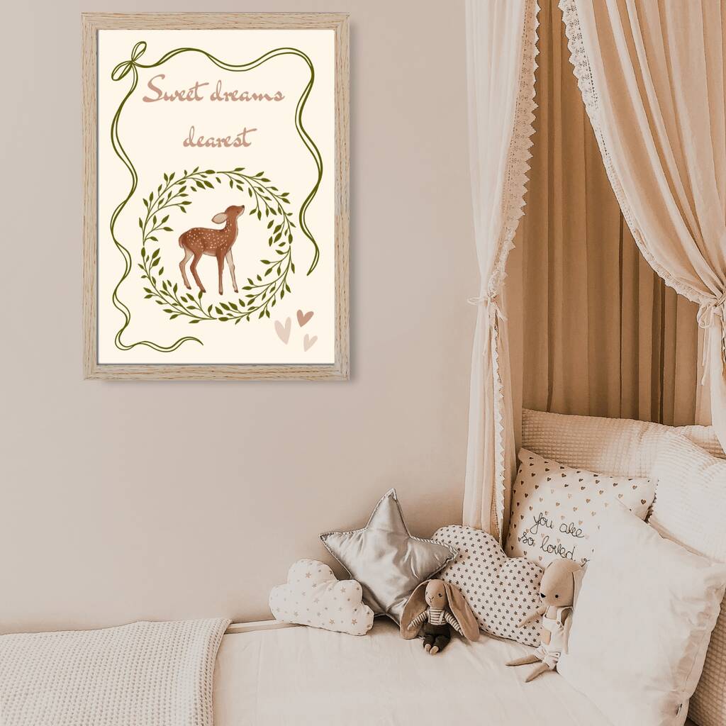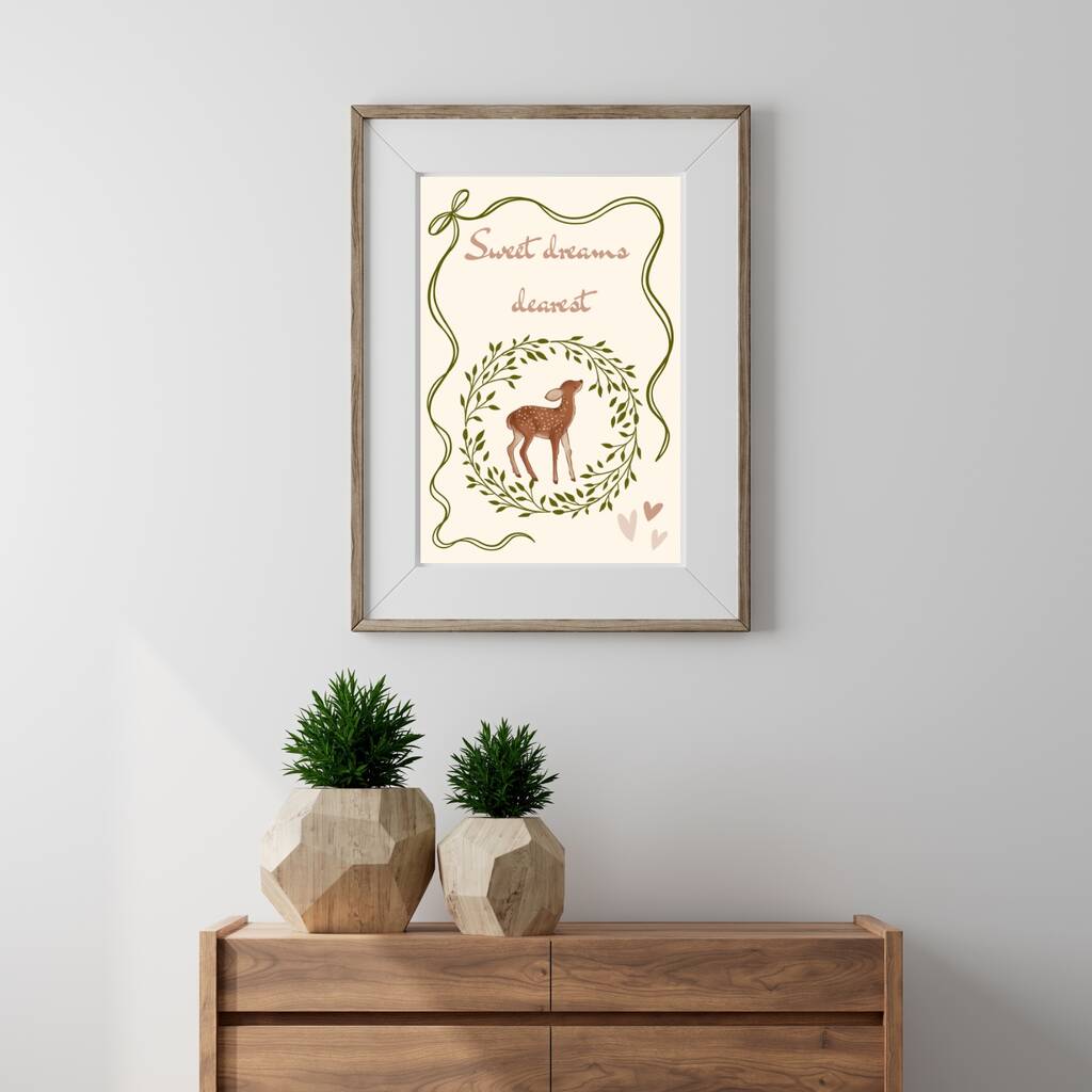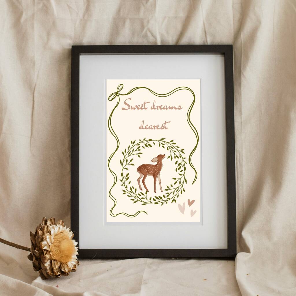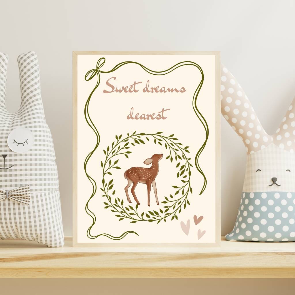 This beautiful design is part of our woodland children and baby collection of art prints and reads "Sweet dreams dearest".