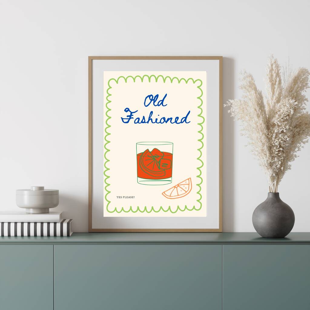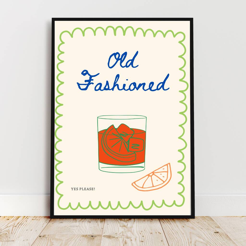 This contemporary design is part of our stylish, typography food and drink collection of art prints and reads "Old Fashioned" and in smaller black text "Yes Please!"