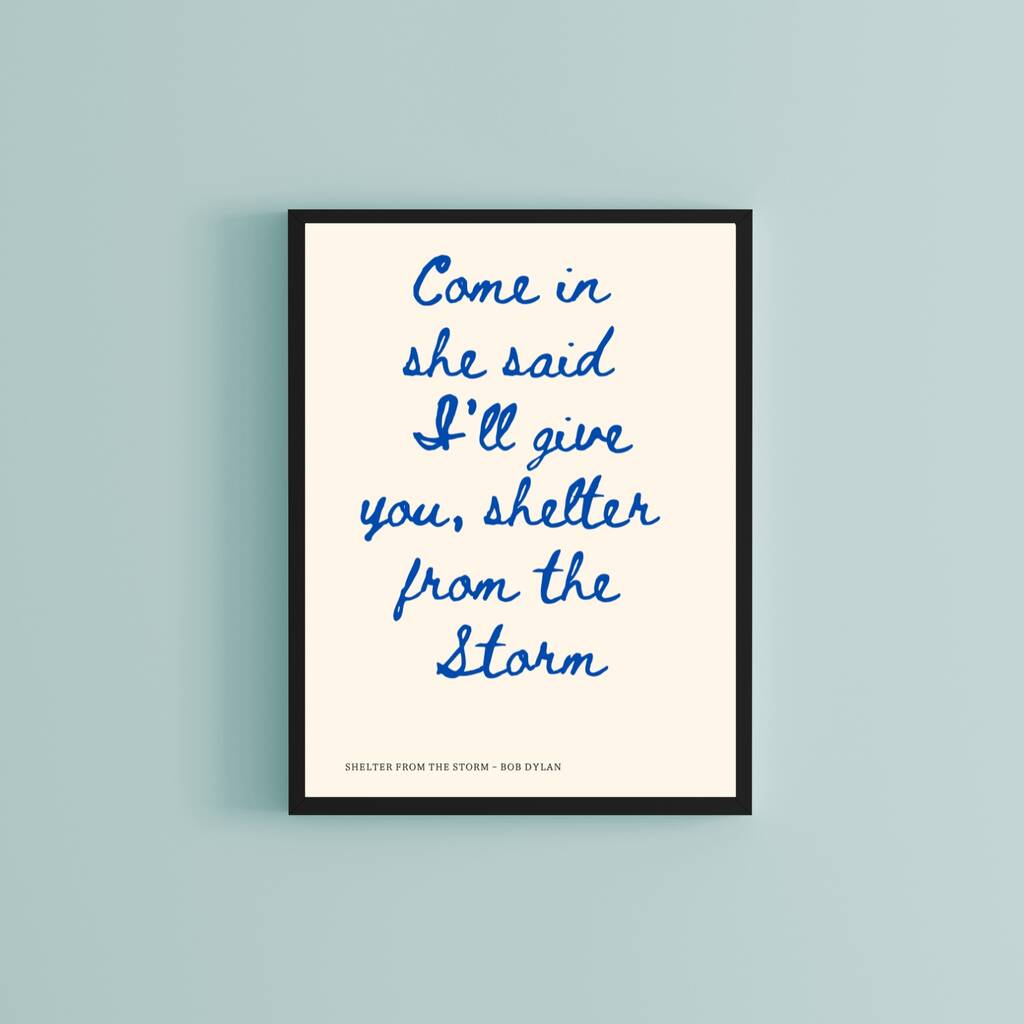 A4 Song Lyrics Print, Bob Dylan, Come In She Said I'll Give You Shelter From The Storm