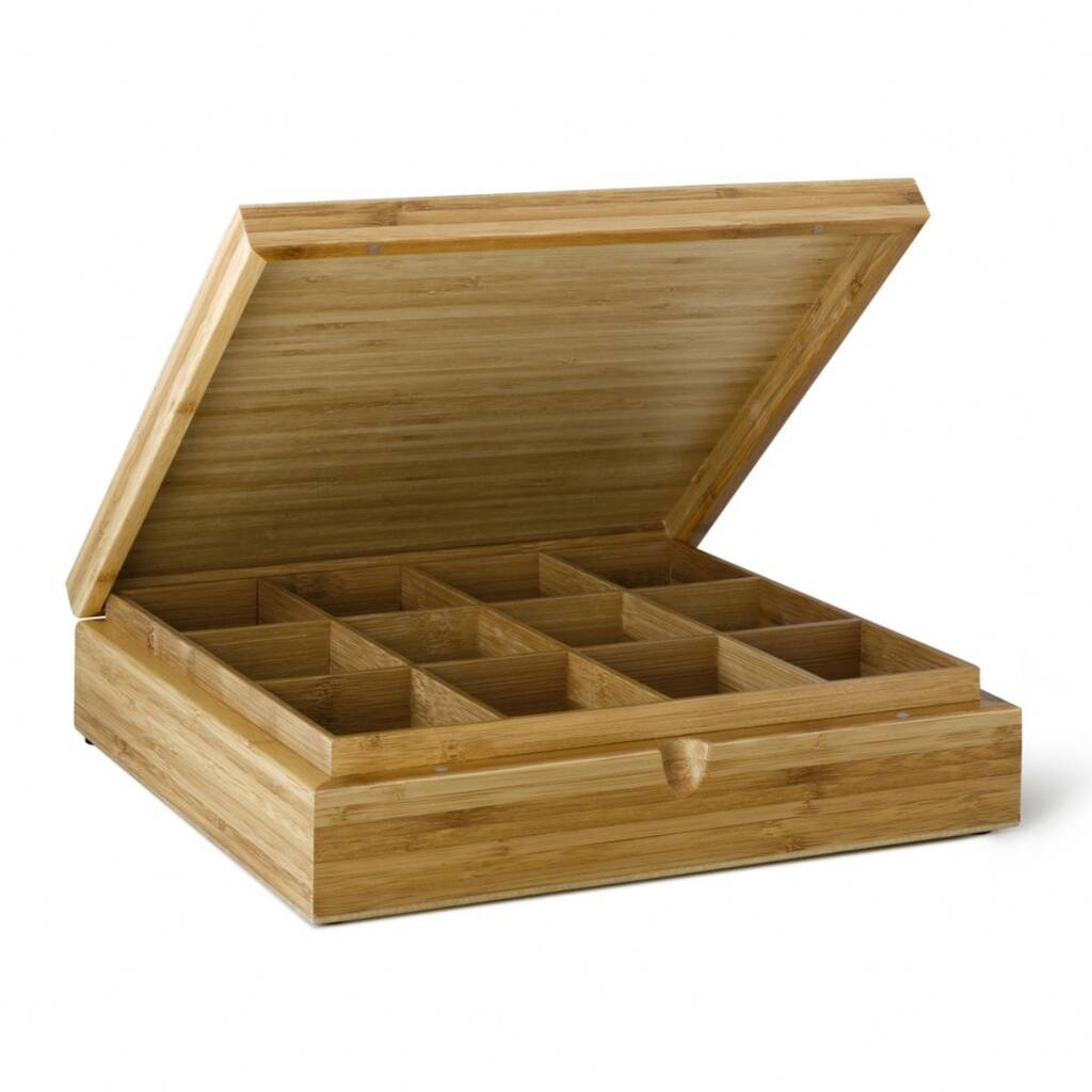 From 6 to 12 inner compartments our tea boxes are manufactured to the highest standards from eco-friendly Bamboo designed to look stunning in any environment.Crafted from premium, eco-friendly bamboo, our elegant tea boxes are designed to impress in any setting. Available with six to twelve inner compartments, each box is meticulously manufactured to the highest standards of quality and durability. The natural bamboo grain adds warmth and sophistication, while the smooth finish enhances its timeless appeal. Perfect for organizing and displaying your favorite teas, these boxes combine sustainability with refined style. Whether placed in a kitchen, office, or tea room, our bamboo tea boxes make a beautiful and practical addition, offering a touch of nature and elegance to every tea-lover’s collection.