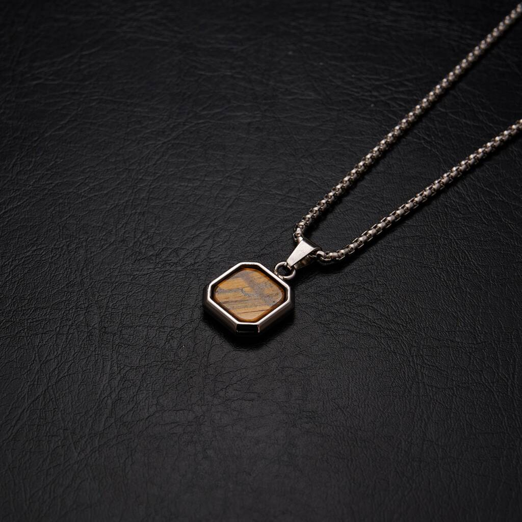 A striking pendant crafted from natural Tiger Eye, known for strength, confidence, and protection. The bold 15mm x 15mm square pendant hangs from a sleek 3mm chain, creating a refined statement piece perfect for everyday wear. Personalise the back with initials, a date, or a short message to transform it into a meaningful keepsake or gift. Presented in a premium gift box, ready to impress.