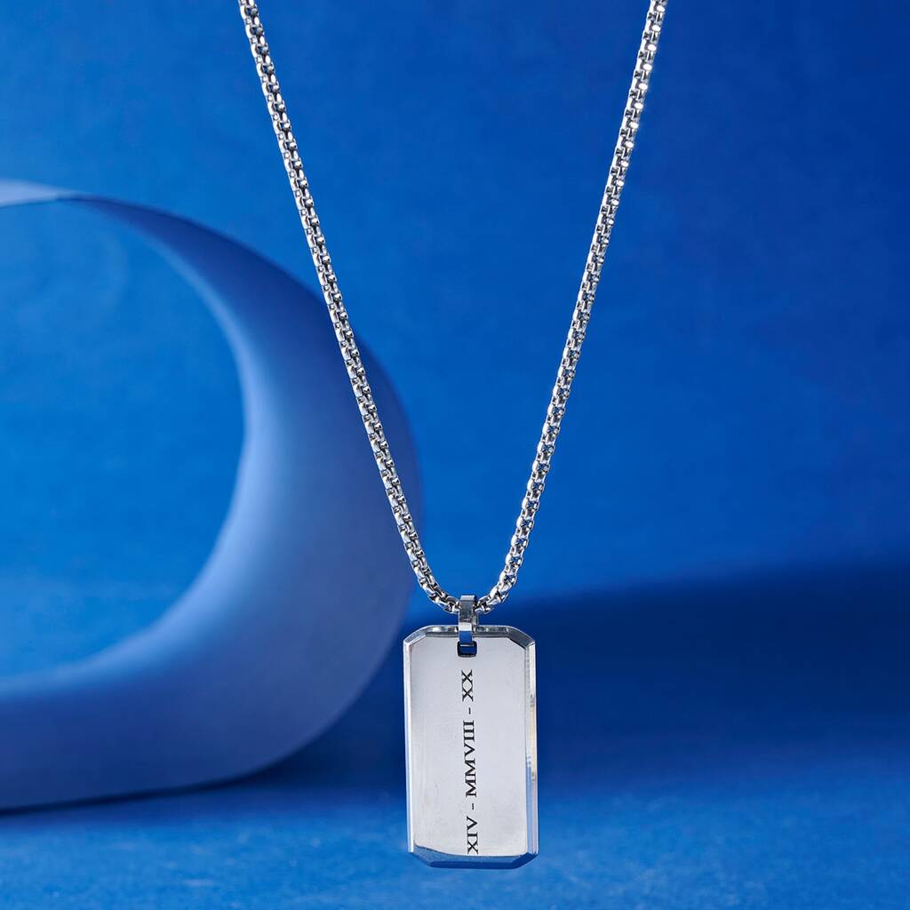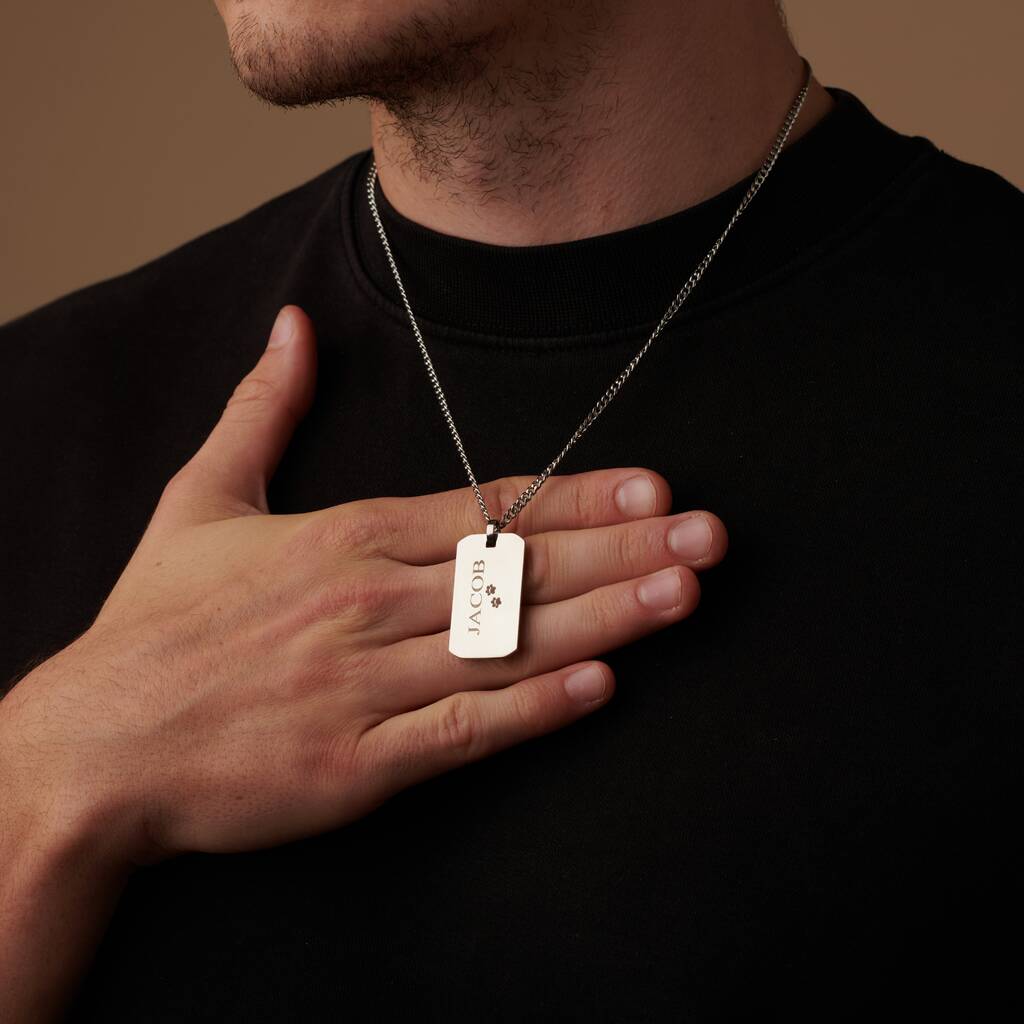 A timeless statement piece, this personalized silver men’s dog tag necklace combines sleek sophistication with individuality
