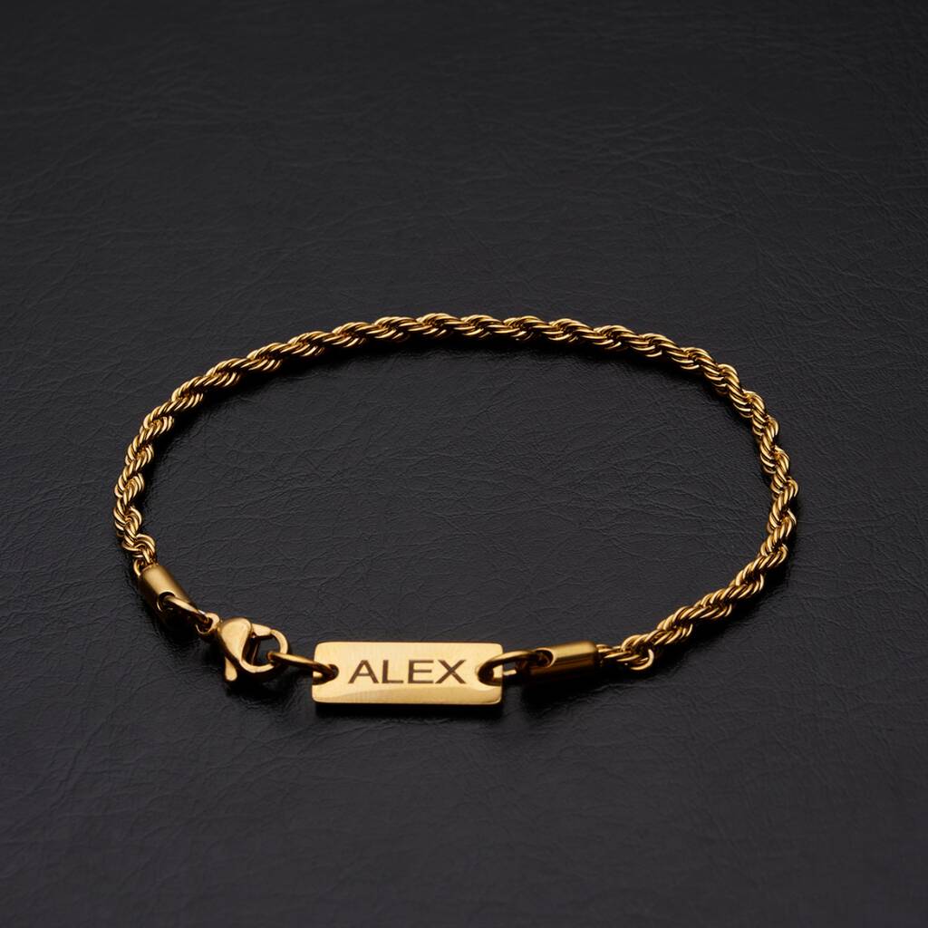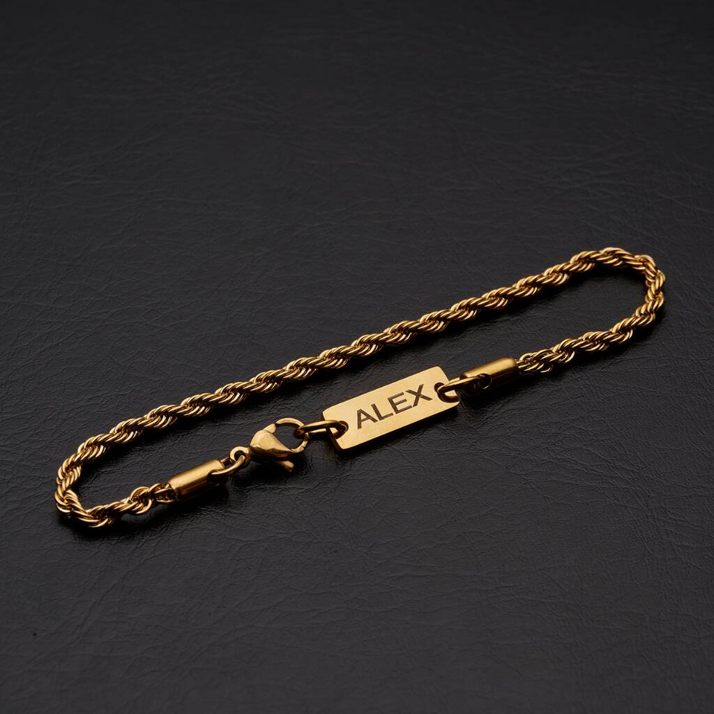 Crafted from premium stainless steel and elegantly finished in 18k gold plating, this bracelet delivers a refined sheen and enduring durability. The solid rope chain exudes a timeless, masculine character, while the engraving plate adds a meaningful personalised touch — perfect for names, initials, dates, symbols, or anything significant to you.