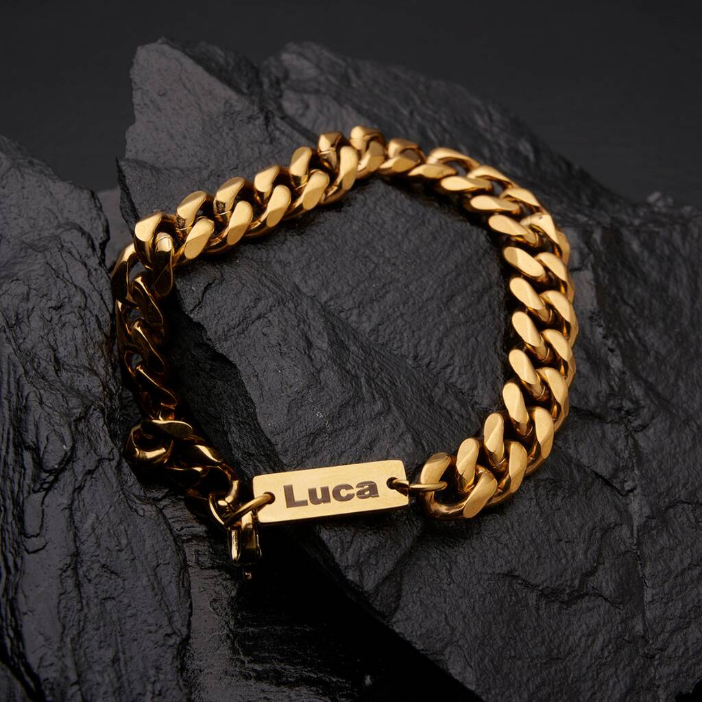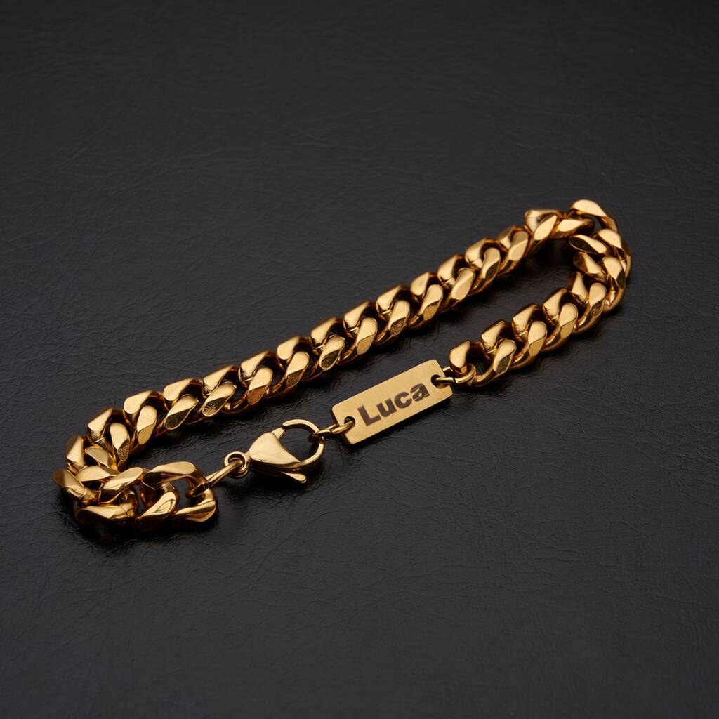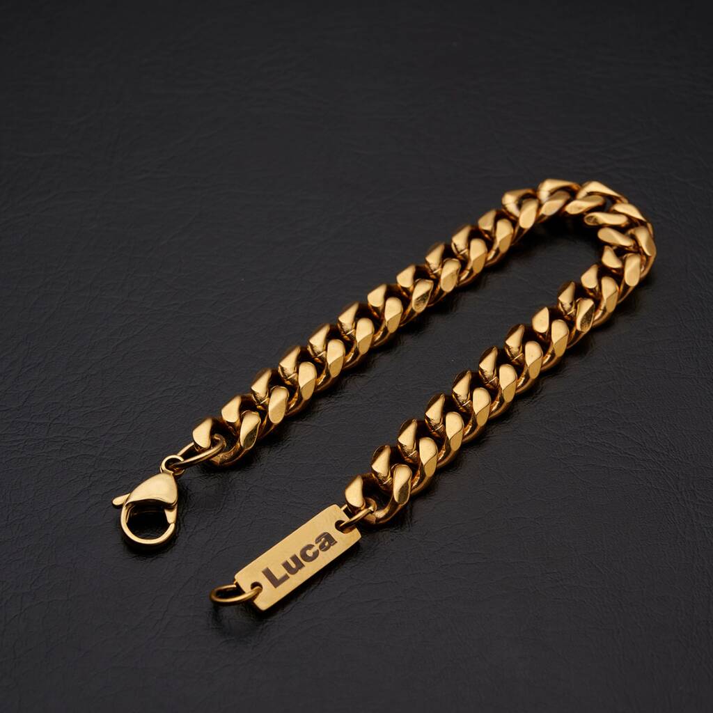 Crafted from premium stainless steel and elegantly finished in 18k gold plating, this bracelet delivers a refined sheen and enduring durability. The solid curb chain exudes a timeless, masculine character, while the engraving plate adds a meaningful personalised touch — perfect for names, initials, dates, symbols, or anything significant to you.