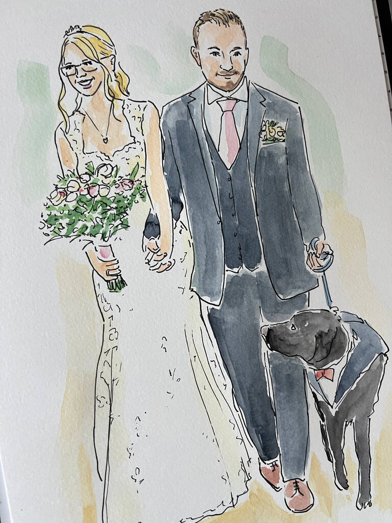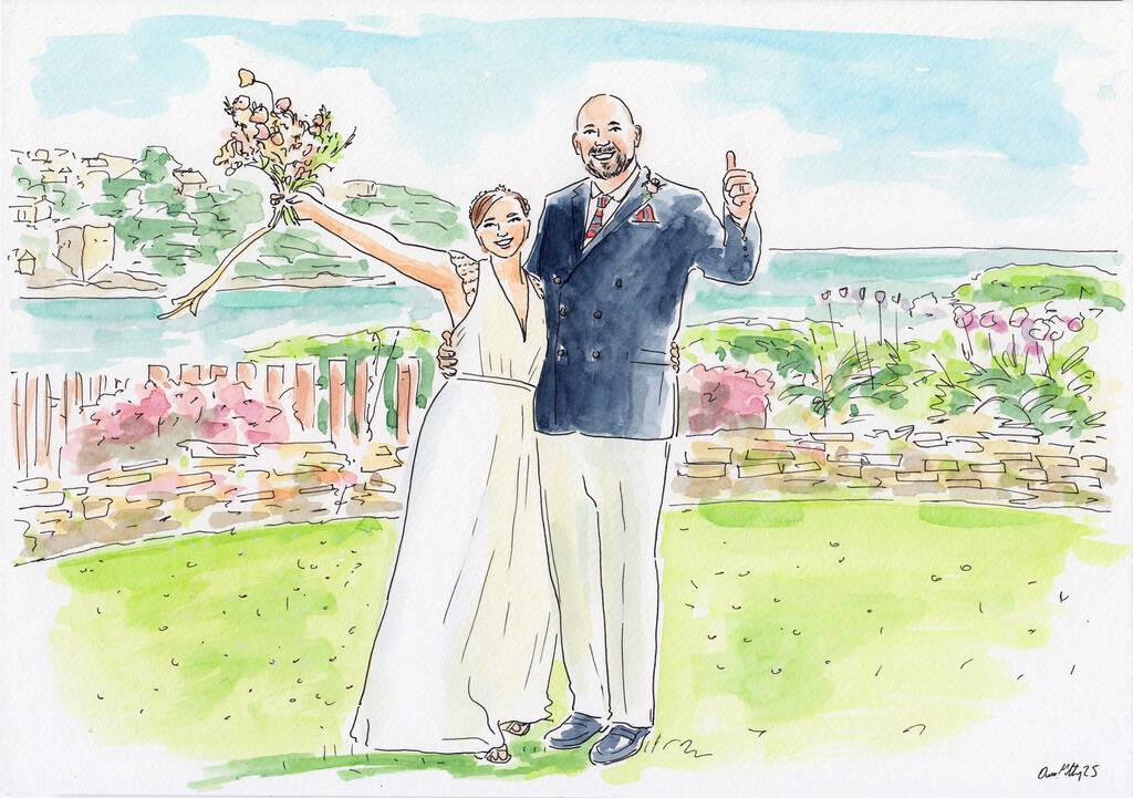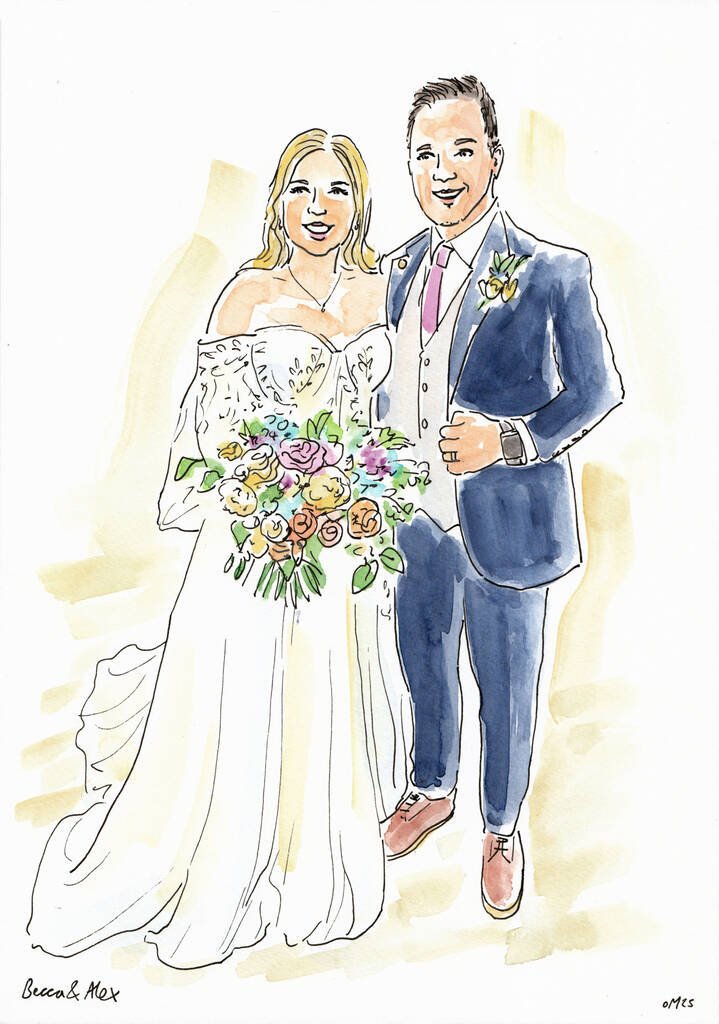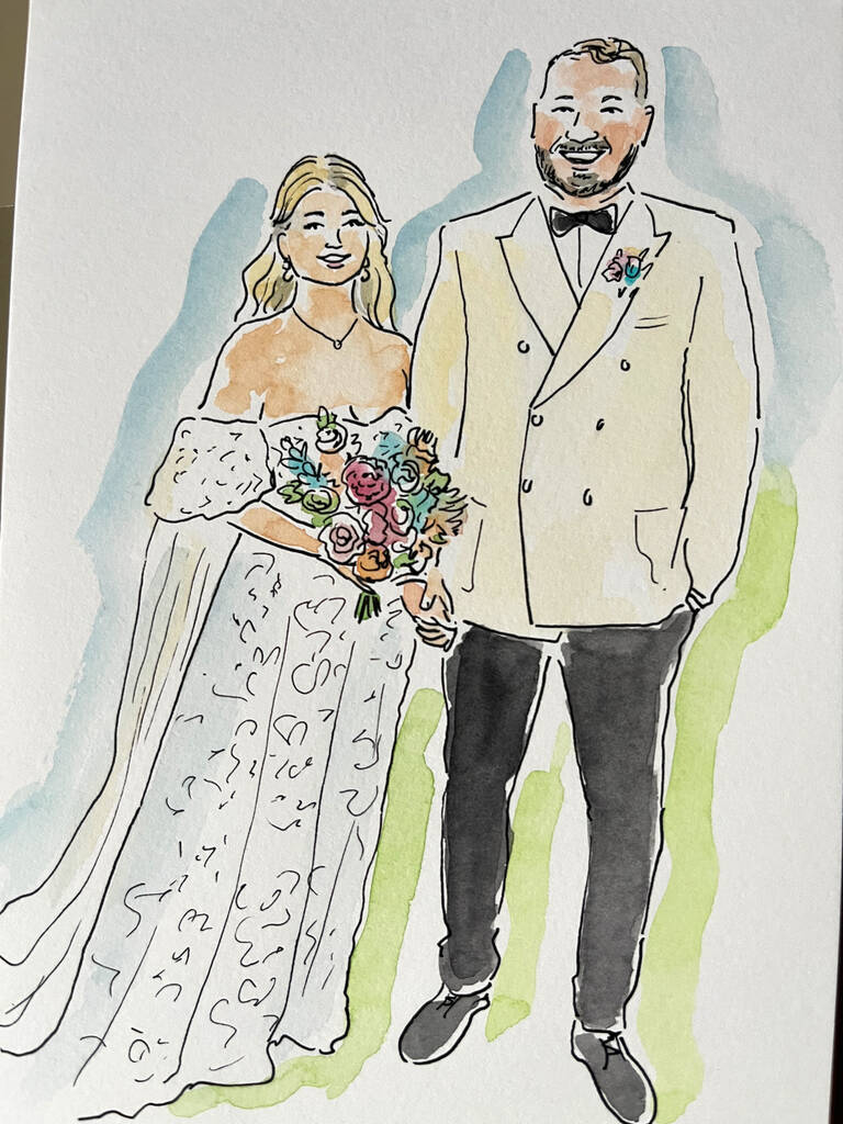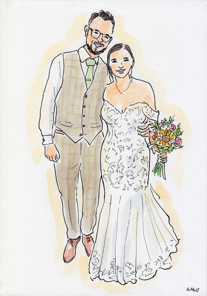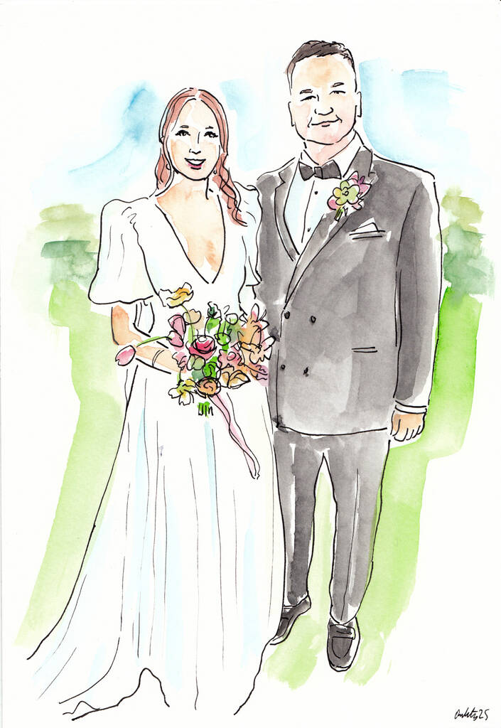 A beautiful hand-drawn portrait of a wedding couple in ink and watercolour