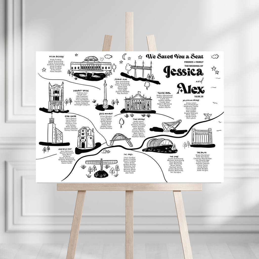 Beautiful bespoke wedding seating plan with each table having its own hand illustration. Colours and font are changable.