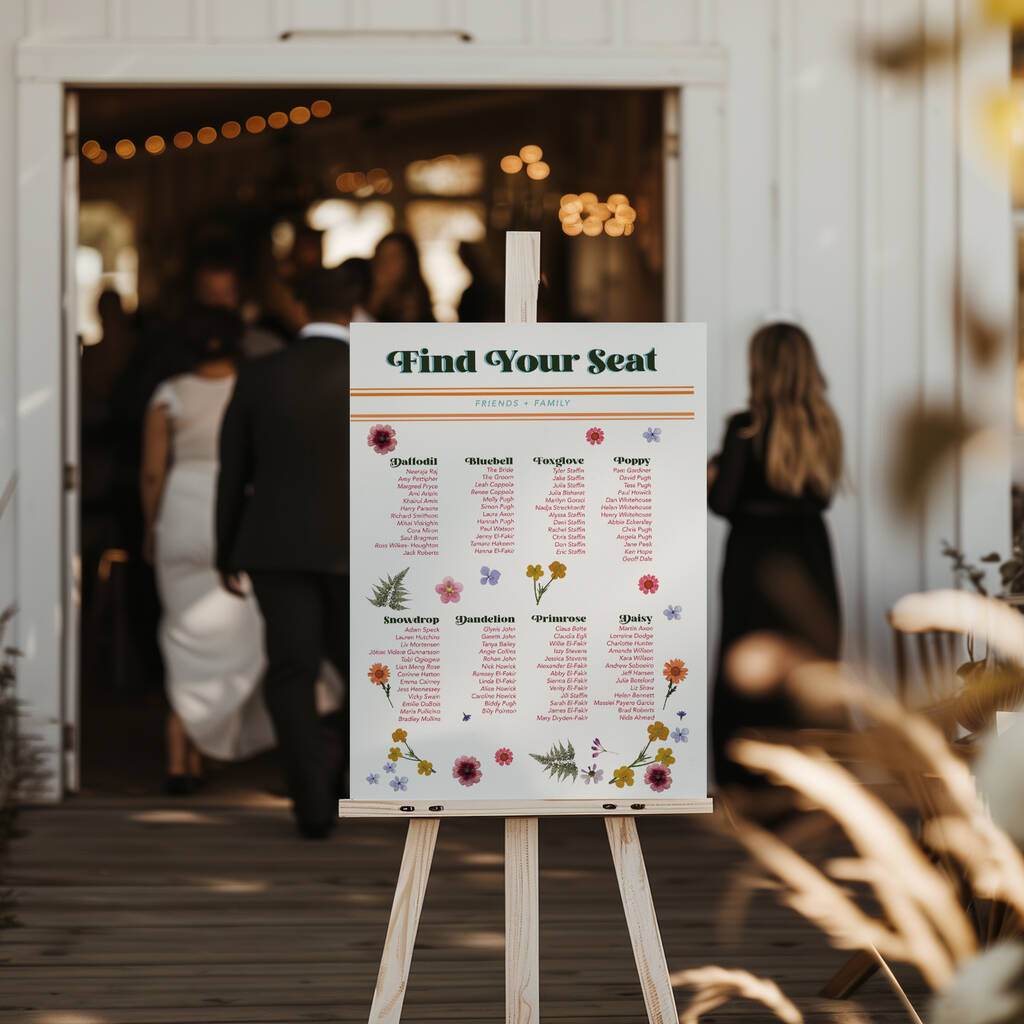 Find Your Seat/Seating Plan with retro font and printed pressed flower details.