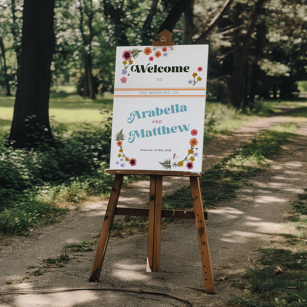 Bright, fun and colourful Wedding Welcome Sign with printed pressed flowers and retro fonts design. Perfect for your fun-filled retro styled or tipi wedding day