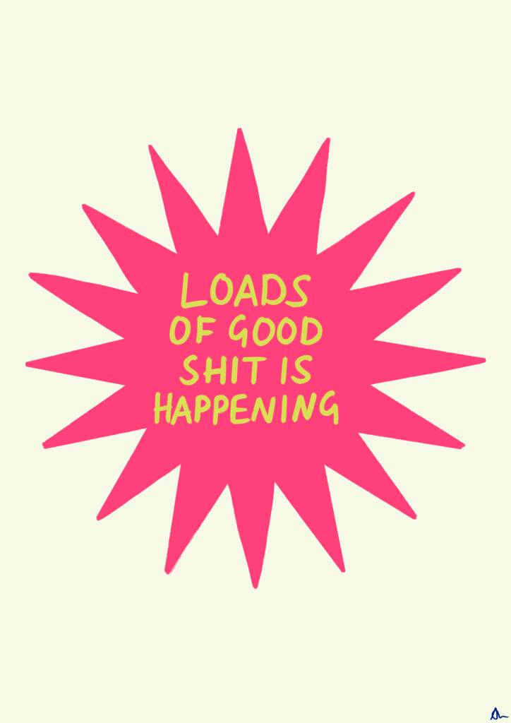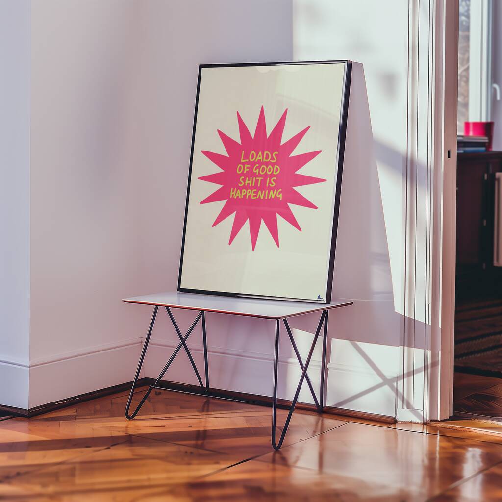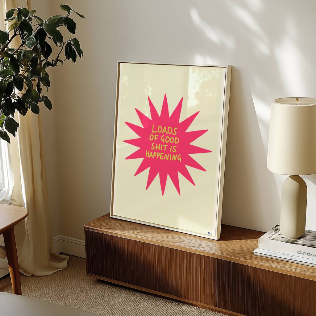 Bring bold positivity into your space with this unapologetically uplifting art print. Featuring a bright pink starburst and the empowering message “Loads of Good Shit is Happening,” this piece is designed to inspire good vibes and spark joy—wherever you hang it.