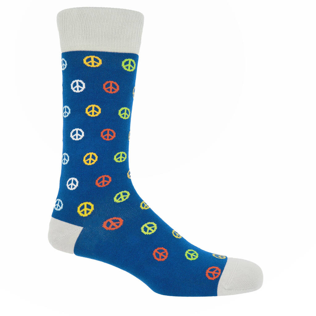 Two pairs of premium socks: fawn Chopper and blue Peace. Crafted in England from Supima cotton. Sustainable luxury with a modern twist.Enhance your sock collection with this distinctive bundle featuring two pairs: the fawn Chopper, showcasing rugby-style stripes in vibrant colours, and the blue Peace, adorned with colourful peace symbols. Both pairs are crafted in England from high-quality materials — the Chopper from soft Supima cotton for a luxurious feel, and the Peace from eco-friendly recycled fibres, combining comfort with sustainability. Designed with a seamless toe for added comfort, these socks embody British craftsmanship and style. Perfect for those who appreciate both fashion and sustainability.