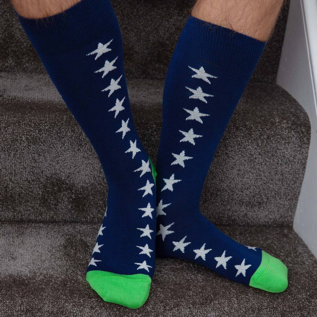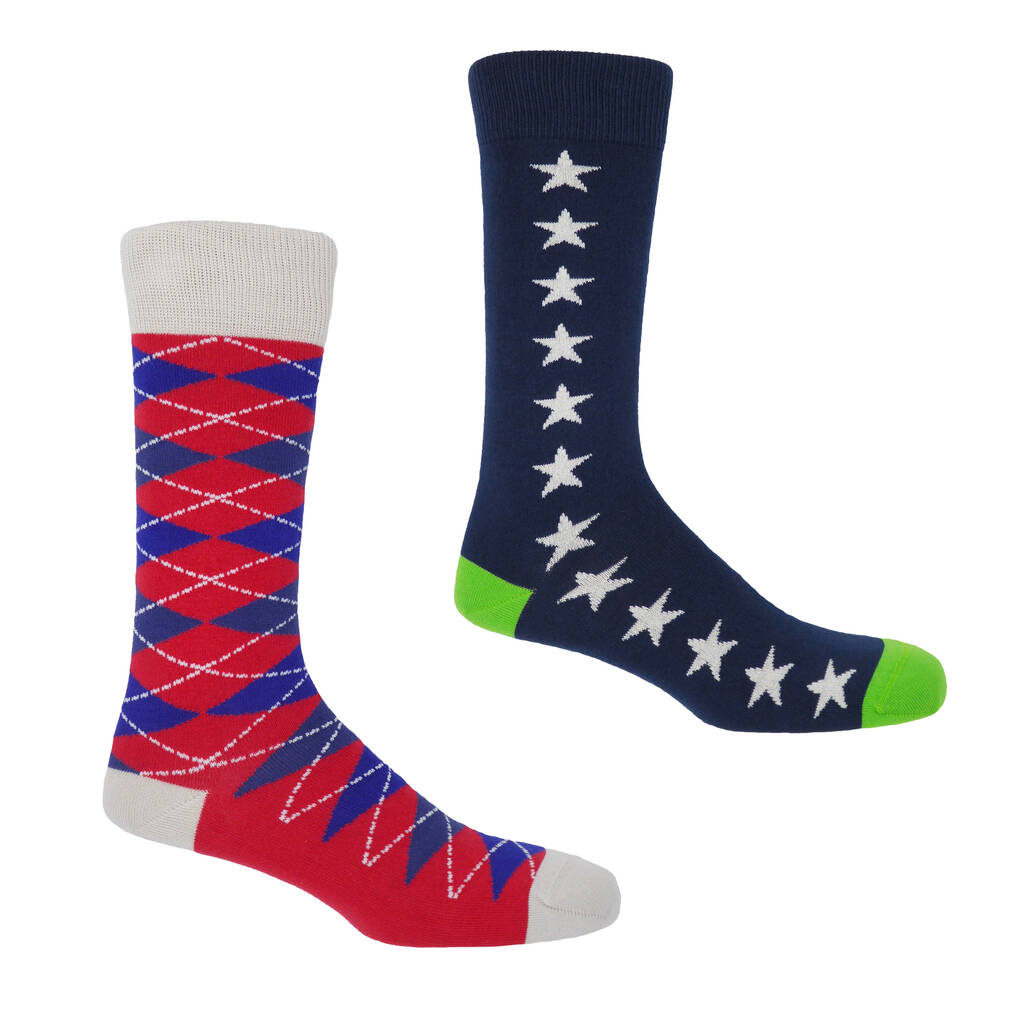 Two pairs of luxury socks: royal blue Starfall and crimson Argyle. Crafted in England from Supima cotton. Sustainable elegance with a bold twist.Enhance your sock collection with this distinctive bundle featuring two pairs: the royal blue Starfall, showcasing a constellation of white stars, and the crimson Argyle, offering a classic diamond pattern with a modern twist. The Starfall socks are crafted in England from high-quality Supima cotton, known for its softness and durability. The Argyle socks are made from the same luxurious cotton, combining traditional design with a splash of vibrant colour. Designed with a seamless toe for added comfort, these socks embody British craftsmanship and style. Perfect for those who appreciate both fashion and sustainability.