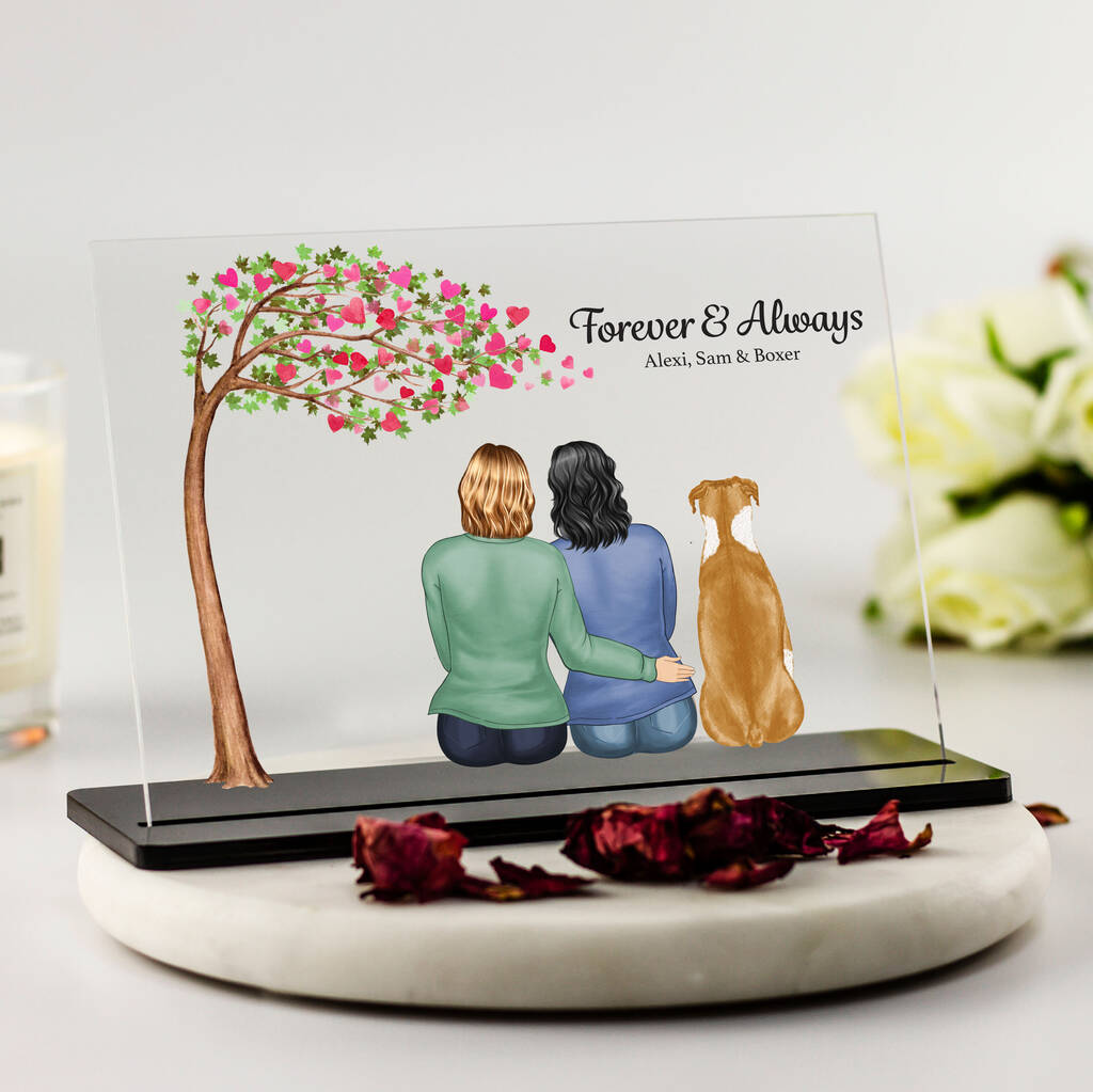 A heartfelt personalised acrylic plaque featuring a couple sitting beneath a tree with heart-shaped leaves, joined by their beloved cats or dogs.