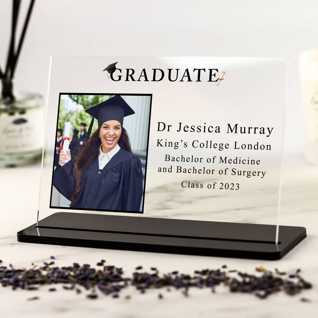 This custom graduation acrylic plaque is a thoughtful keepsake to mark such a special achievement. At the top, bold text proudly reads GRADUATE, while your chosen photo takes centre stage. Next to the image, their name, university, degree, and year of graduation are beautifully displayed, making this a modern and elegant memento. Whether you’re searching for a graduation gift for him or a graduation gift for her, this plaque is a stylish way to celebrate hard work and dedication. A lasting reminder of success, it’s perfect for a son, daughter, sibling, or friend.
