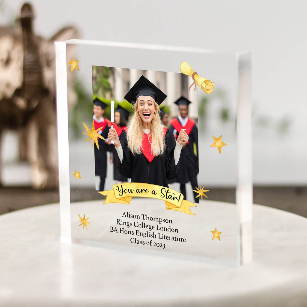 A celebratory personalised graduation photo block featuring gold stars, a scroll, and a shining “You Are A Star!” banner.