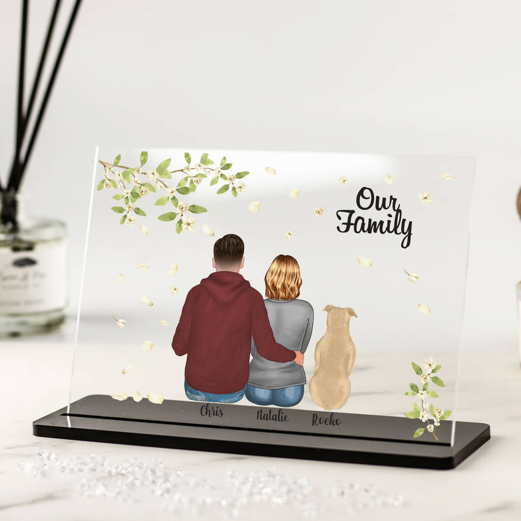 A beautiful personalised acrylic plaque featuring a couple and their pets beneath white blossom — the perfect way to celebrate your family.