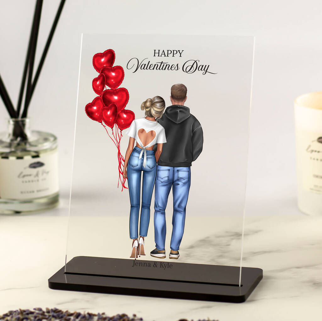 A romantic personalised acrylic plaque featuring a couple with heart-shaped balloons — the perfect gift for Valentine’s Day.