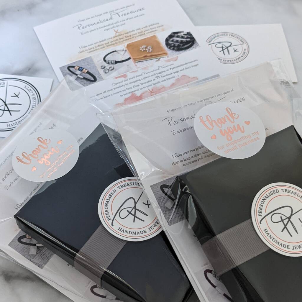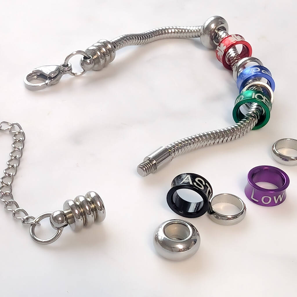 Customizable Rings: Each ring is expertly engraved with your chosen text. Rings are separated with stainless steel hoops and secured in place with two stopper beads on each side.
