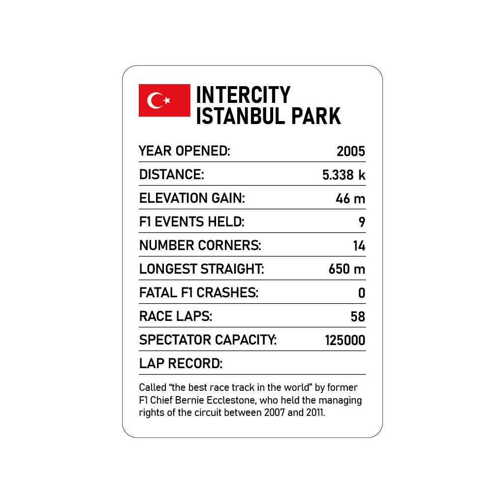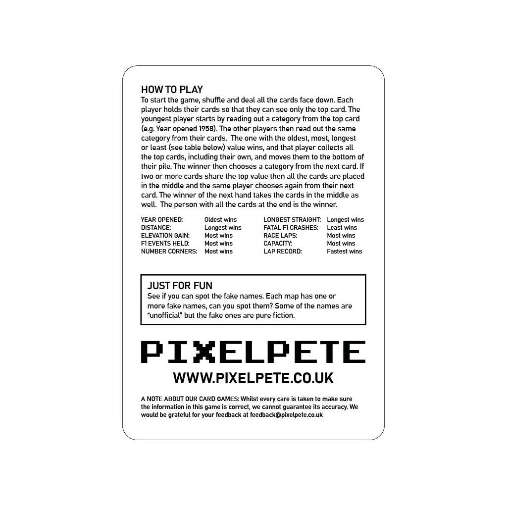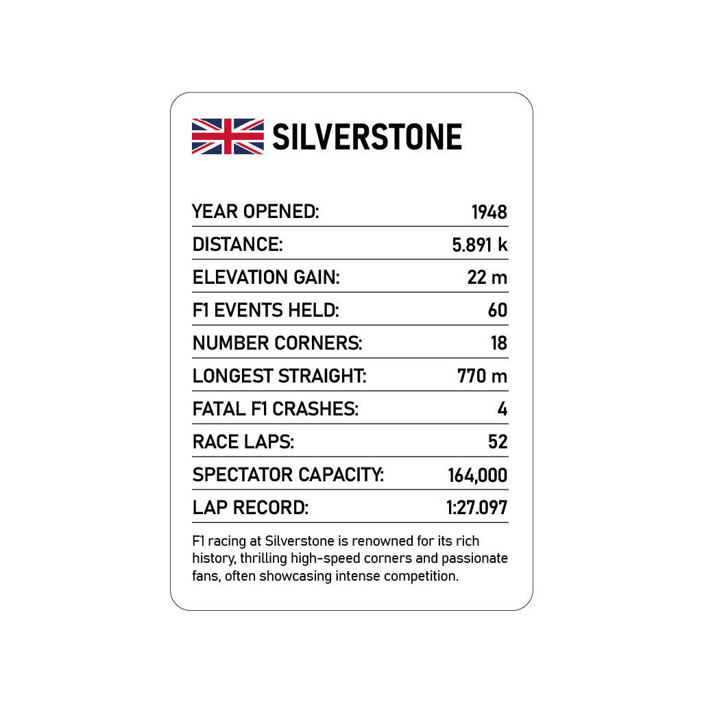 TRUMP CARDS FOR GROWN UPS Track Stats F1 is a thrilling card game that brings the world’s most iconic racetracks to life. Each card features a unique F1 circuit with stats on its history, lap times, length, straights and turns. Compete with any number of friends to find out which circuit reigns supreme based on key attributes. Whether it’s the high speed straights of Monza or the twisty turns of Monaco, this game is packed with fascinating facts and figures, making it the ultimate test for racing enthusiasts!Tracks included in this issue: Silverstone, Circuit de Monaco, Barcelona Catalunya, Circuit Zandvoort, Albert Park Circuit, Circuit Gilles Villeneuve, Red Bull Ring, Shanghai International, Hungaroring, Circuit de Spa-Francorchamps, Bahrain International, Jeddah CornicheCircuit, Suzuka, Imola, Miami International, Nürburgring, Hockenheimring, Monza, Zolder, Nevers Magny-Cours, Korea International, Baku City Circuit, Circuit Paul Ricard, Las Vegas Strip Circuit, Marina Bay Street Circuit, Sepang International, Hermanos Rodraguez, Intercity Istanbul Park, InterlagosCircuit, Circuit of the Americas, Lusail, Yas Marina, Oscar y Juan Galvez, Sochi Autodrom.