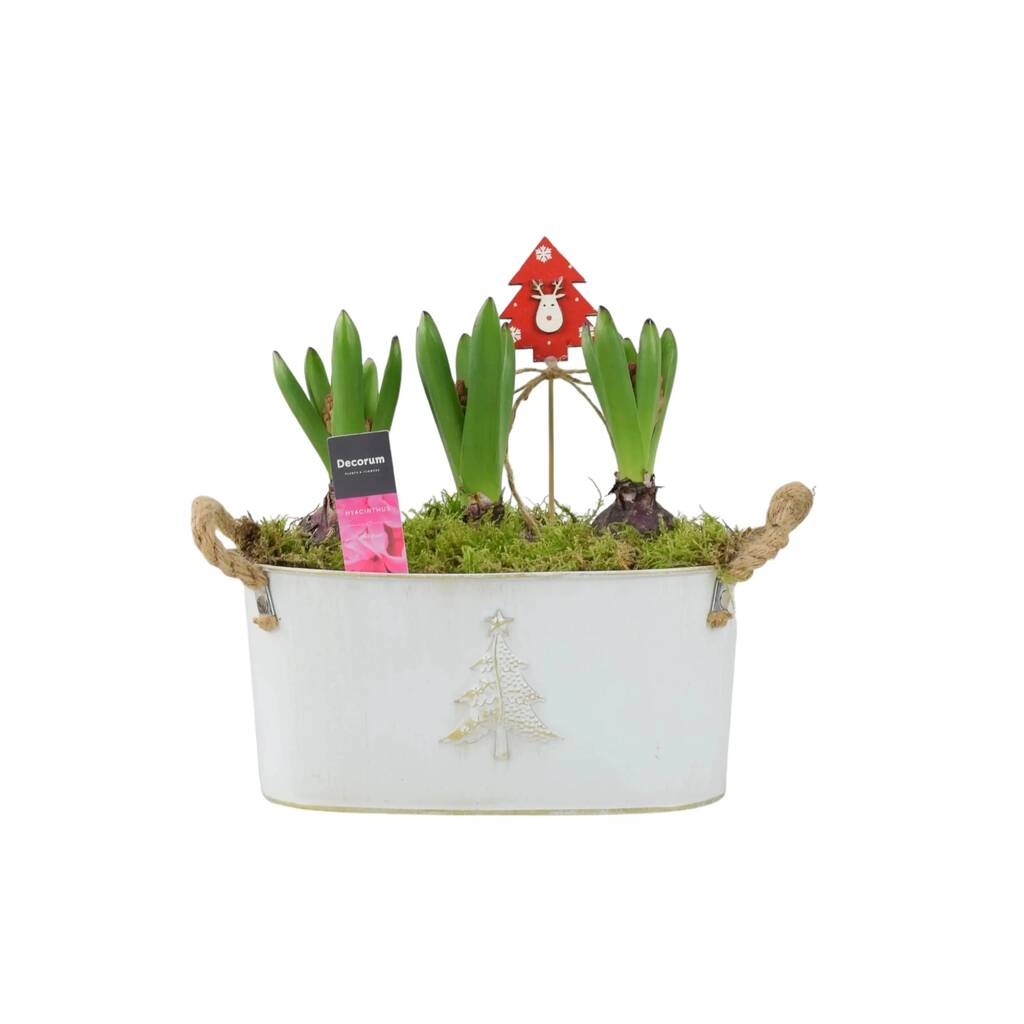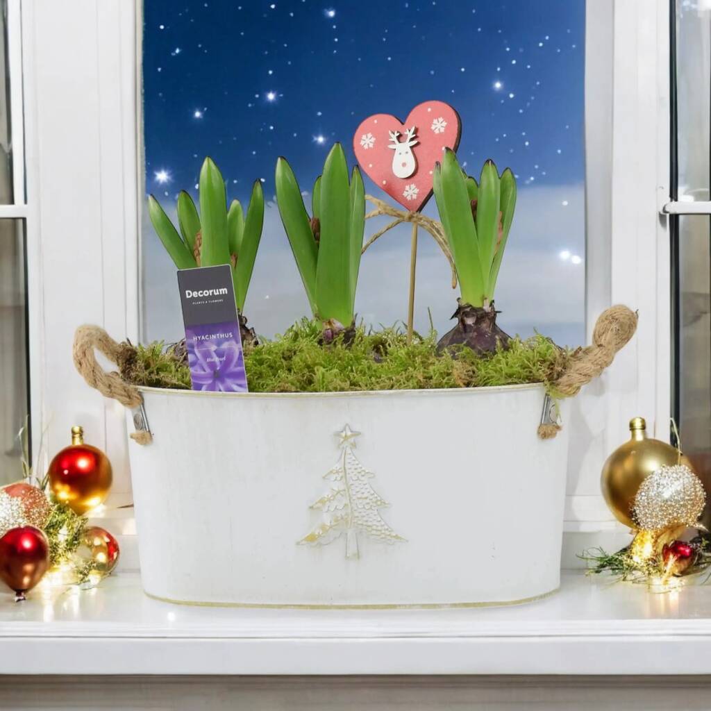 The Christmas Hyacinth Trough is thoughtfully crafted to bring natural beauty and seasonal spirit to your home or garden. At its heart are three premium hyacinth bulbs, planted securely in a rustic-style metal trough that adds a charming touch to your Christmas décor.