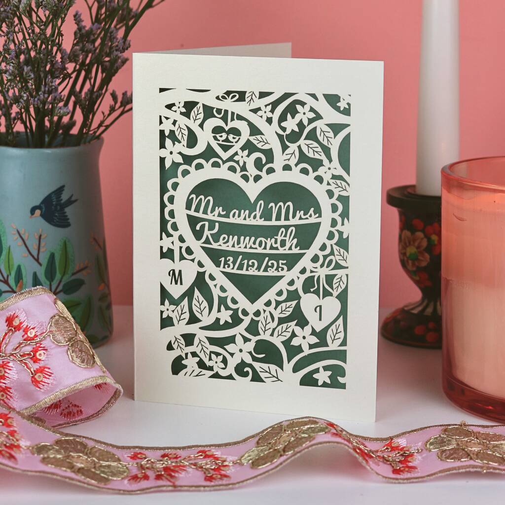 A completely special, personalised, hand finished, luxury wedding card, laser cut and made to order with your chosen paper colour.
