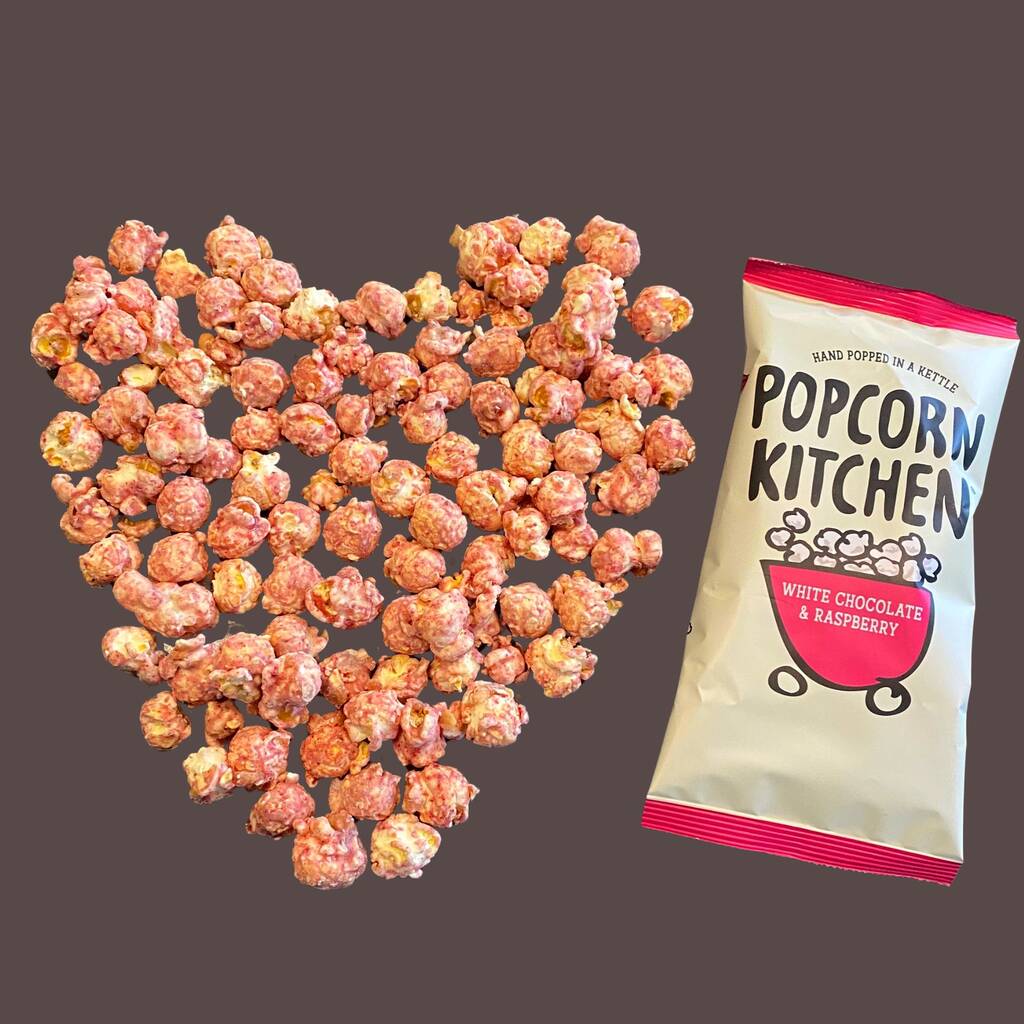 White Choc & Raspberry Popcorn: Popped Corn, Sugar, Glucose Syrup, White Chocolate (19%)(Sugar, Cocoa Butter, Whole Milk Powder, Emulsifier: Soya Lecithin, Natural Vanilla Flavour), Butter (contains Milk), Dried Raspberries, Rapeseed Oil, Salt, Emulsifier: Soya Lecithin, Raising Agent: Bicarbonate of Soda, Natural Flavouring. Milk solids 14% minimum. Contains: Milk and Soya.