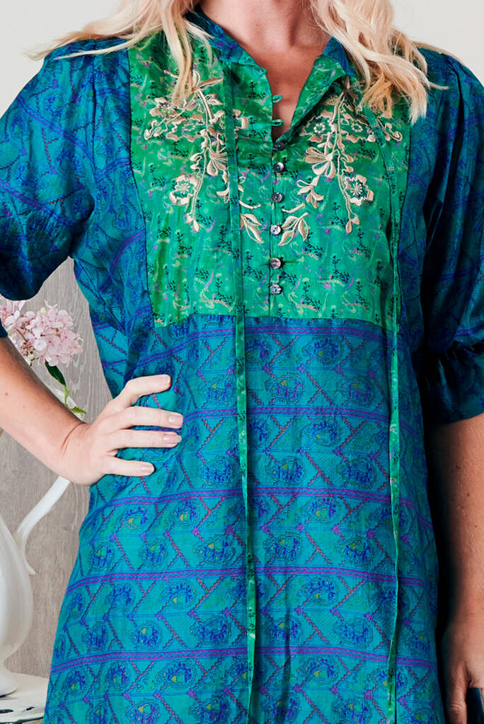 Yasmin Silk Print Embroidered Dress 10, 1 of 4