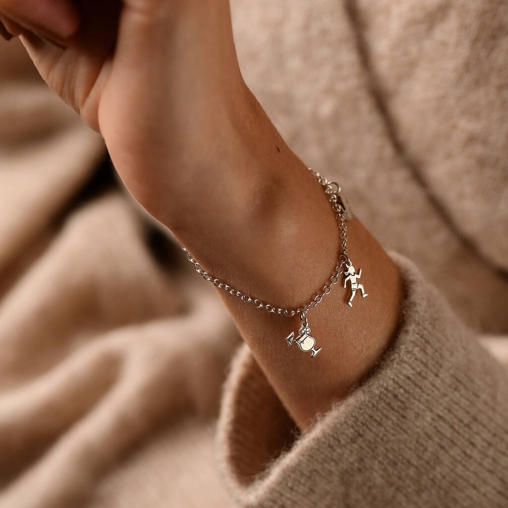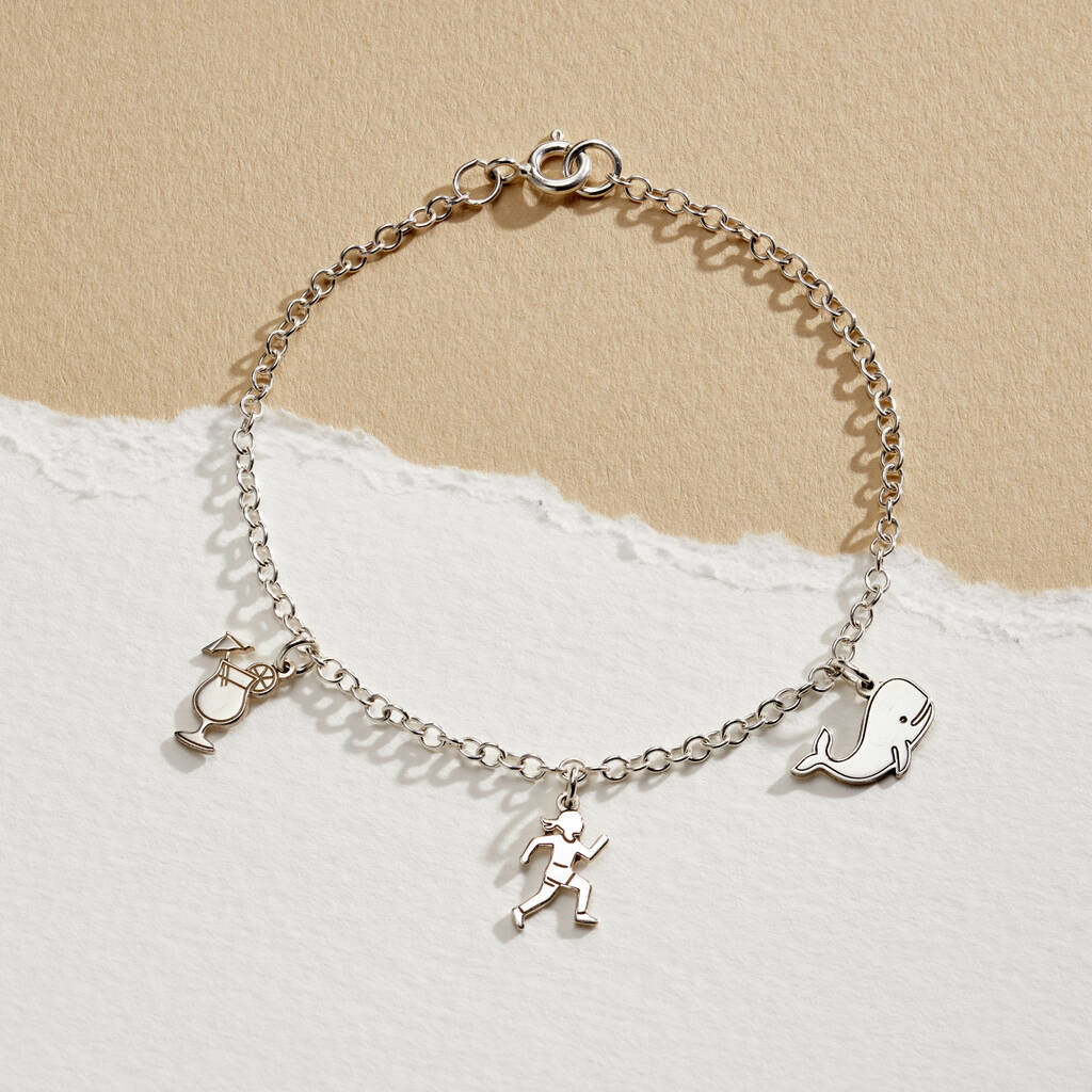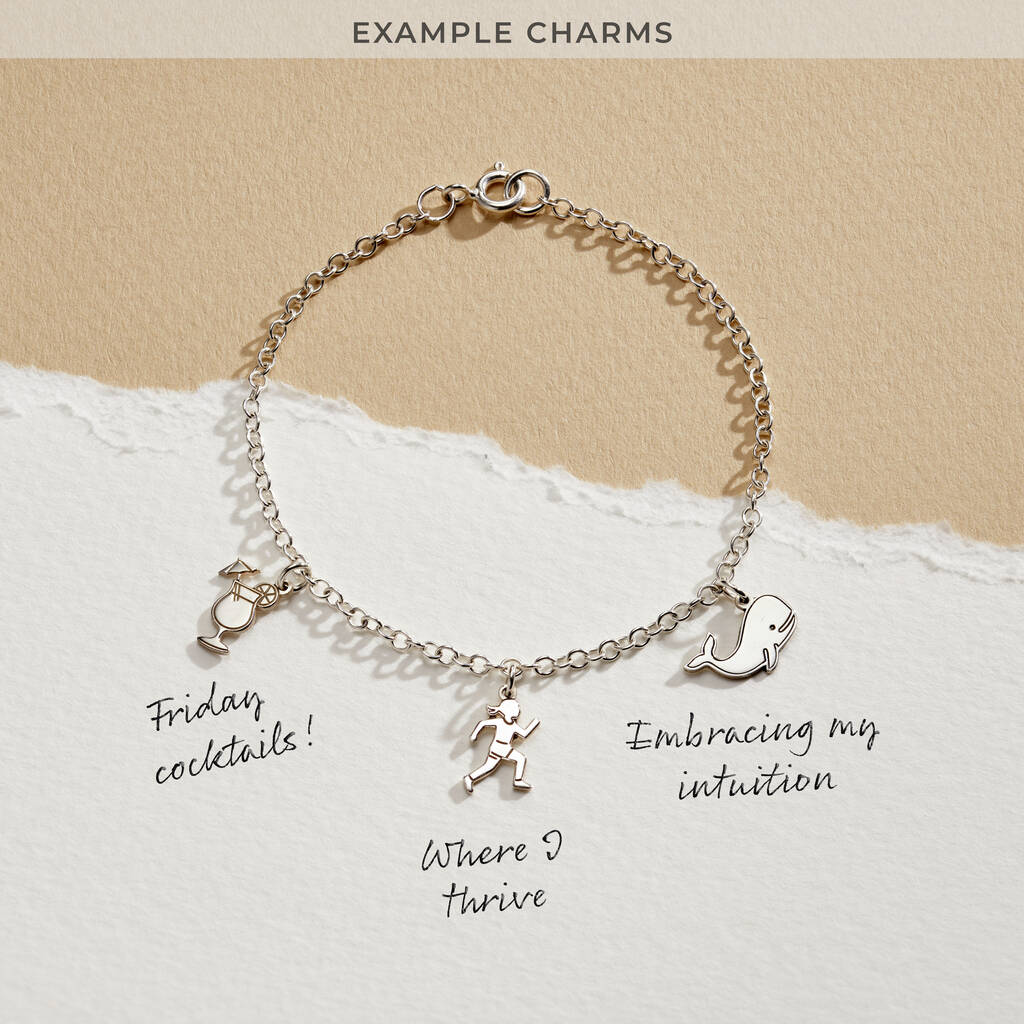 Our Personalised Dinky Story Charms are the ultimate in personalisation: handmade just for you, from a single word, memory, or idea. This gorgeous charm bracelet features your chosen three bespoke charm suspended from one of our stunning trace chains. Simply outline how you want your charms to look and our jewellers will turn your idea in a design before engraving it in sterling silver. This bespoke charm bracelet is the perfect way to create something truly unique. We can create charms that, celebrate that meal by the sea with a Prawn Charm, or that new years swim with a swimmer charm.