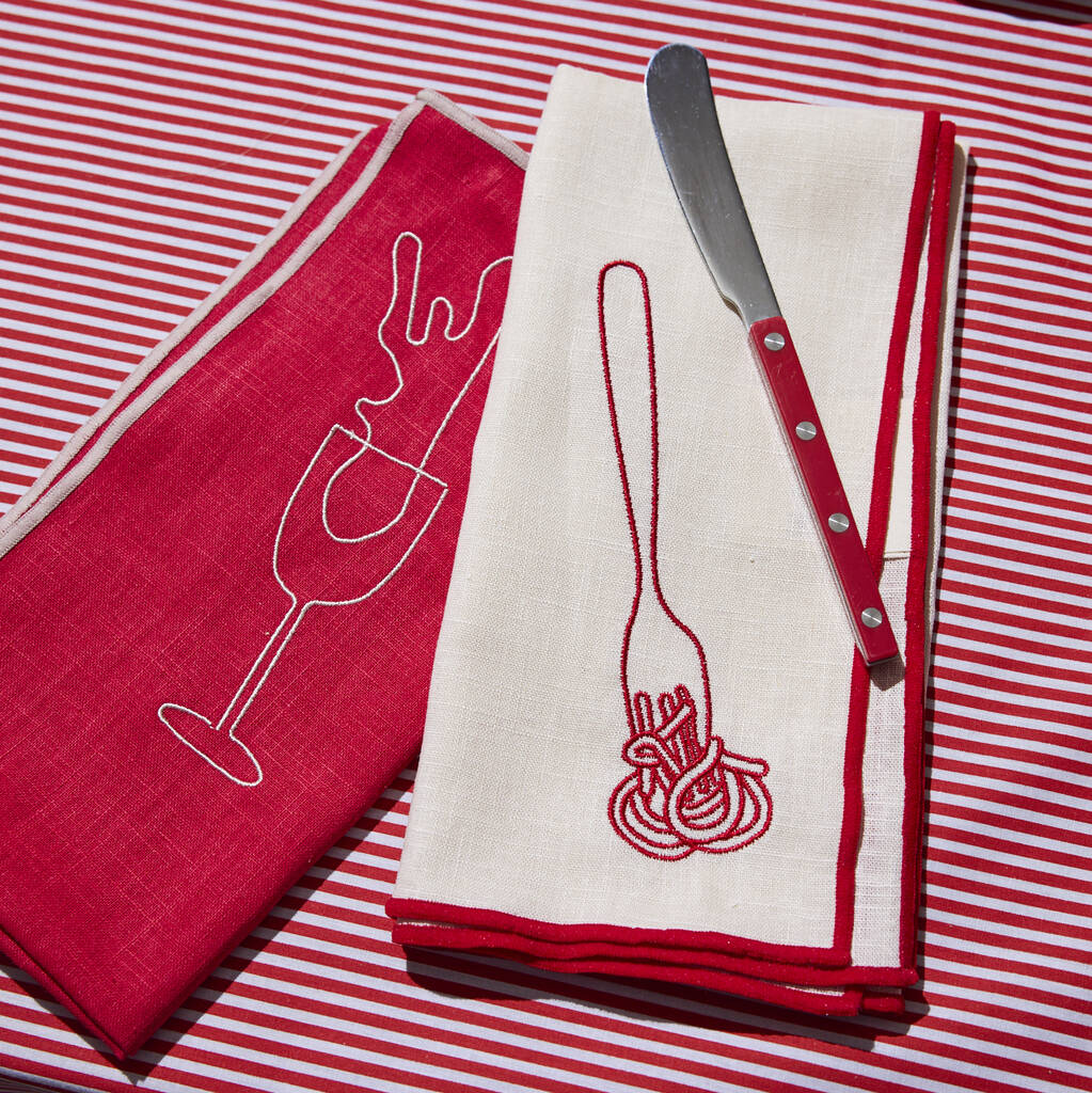 Bring joy to your table with our new linen blend napkins, designed to brighten any occasion. Featuring a bold wine glass design embroidered on a red cotton napkin, they strike the perfect balance between fun and sophistication.