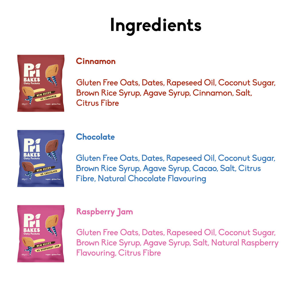 - Oaty Pockets – Raspberry Jam x 2 Packs, Cinnamon x 2 Packs, Hazelnut 2x Packs