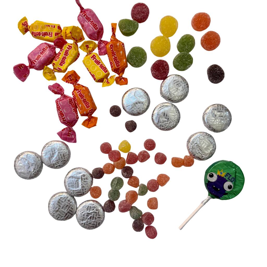 Each handmade, hand printed monochrome cracker contains two small bags of vegan friendly sweets, (heat sealed into home compostable bags), a dairy free creamy chocolate lollipop, 8 Fruit-tella chews, and two crackers each containing 5 dark chocolate mint fondants.