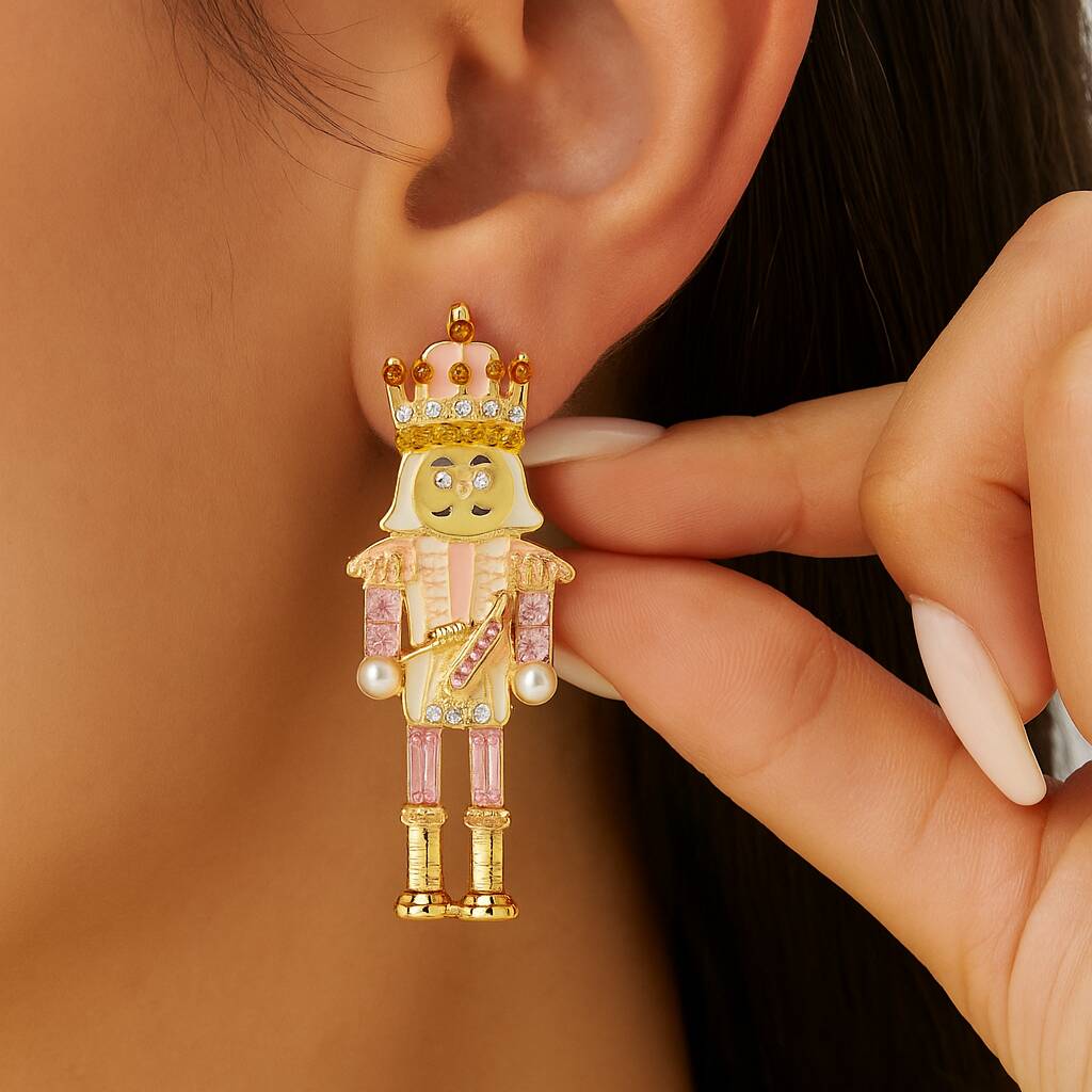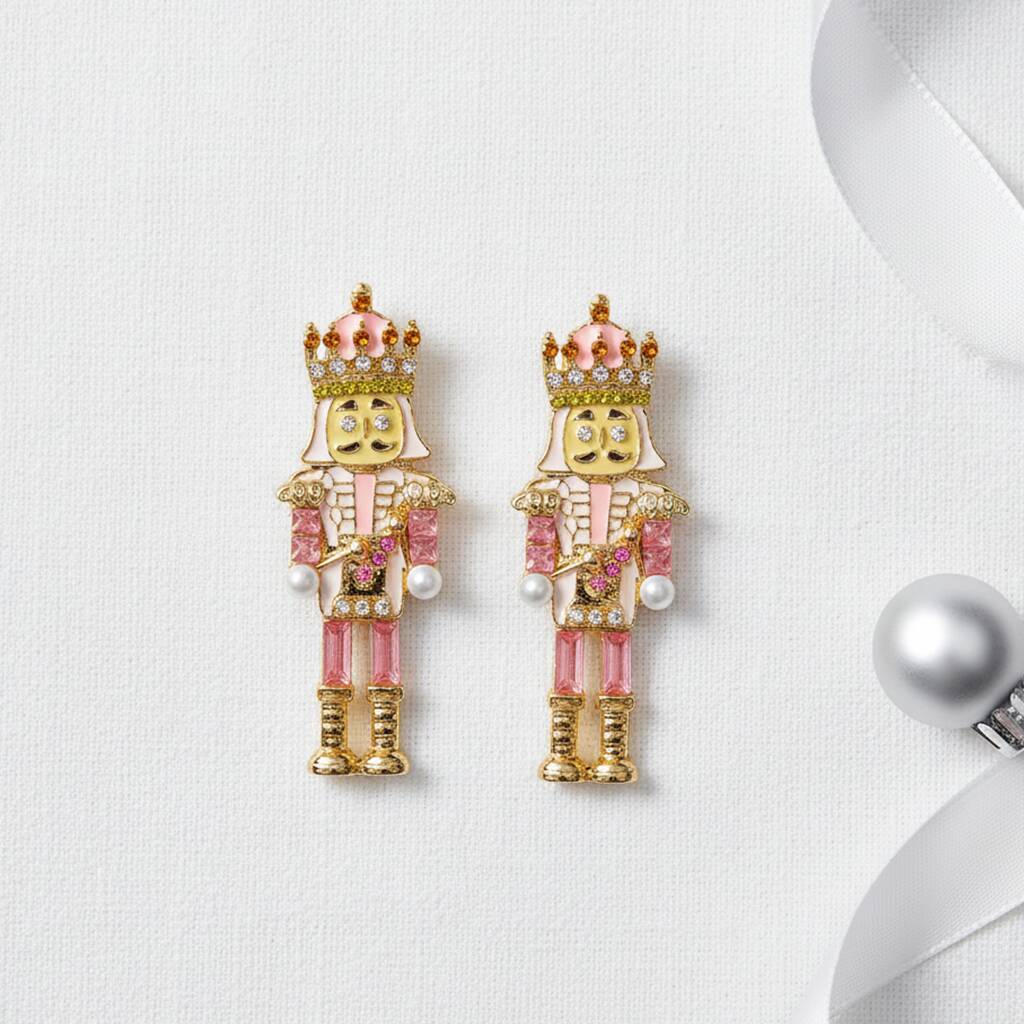 Festive and fun nutcracker earrings in pink and gold. A playful Christmas statement that adds instant sparkle to any winter outfit.