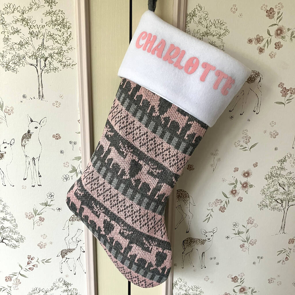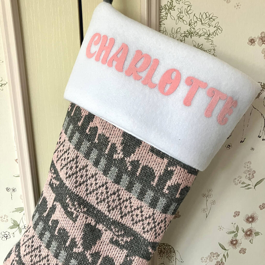 Our Personalised Pink/Grey Nordic Knitted Christmas Stocking is the perfect Christmas decoration for your home and will bring joy to both adults and children.