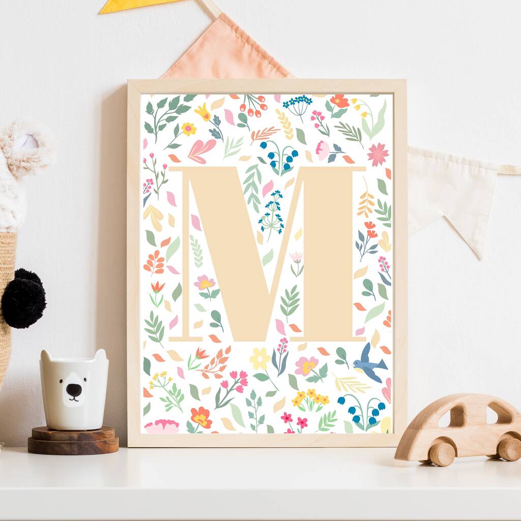 A beautiful floral print of your choice of letter and colour. Perfect for children's bedrooms and playrooms. Best Selling nursery art by Sarah Manovski.