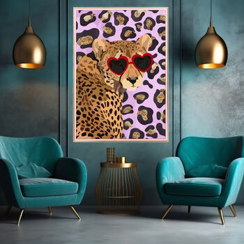 A print of a unique original artwork of a cheetah in customisable glasses against a colourful leopard print background! Great gift for her for christmas!