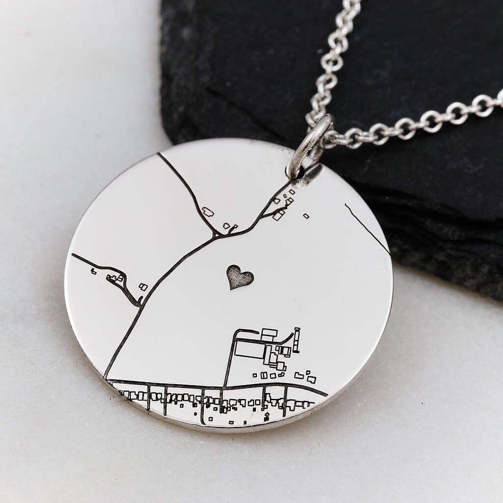 Custom designed and engraved just for you in a choice of afordable sterling silver sheet or thicker, weightier 100% recycled sterling silver disc pendant, your custom map necklace has a cool abstract look, each one is bespoke made based on your chosen address, city or co-ordinates. It could be where you grew up, where you met your partner, your first home together, the place you got married in, or just somewhere in the world where you left your heart.