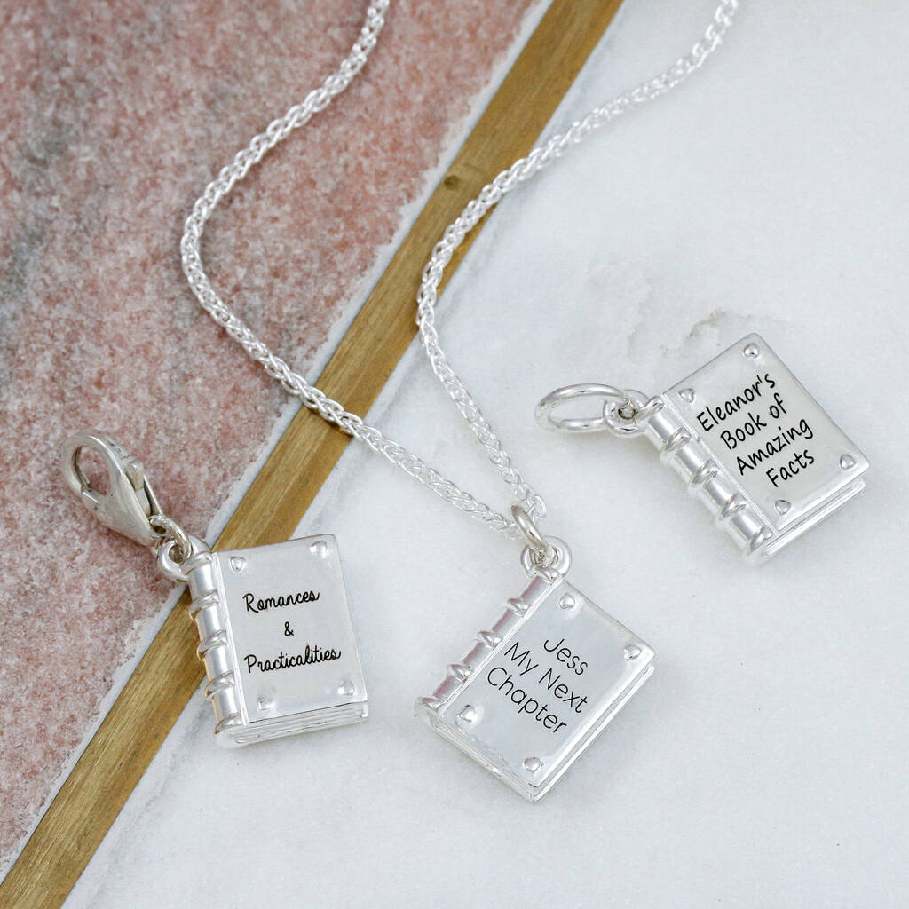 A heavy silver book charm engraved with a special date, initials, title of first novel, a first edition in the story of your life.